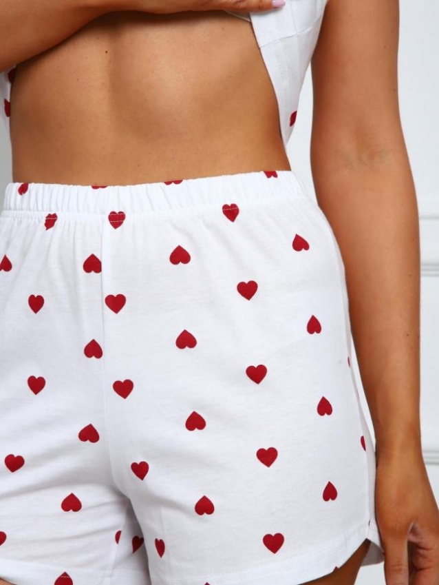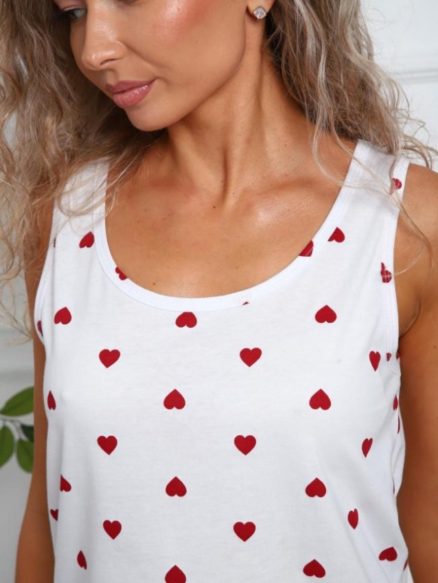 Пижама Лучия выполнена из набивного трикотажного полотна "кулирка", состоит из футболки и шорт. Футболка полуприлегающего силуэта с круглым вырезом горловины, без рукава на широких бретелях. Вырез горловины и проймы обработаны кантом в цвет основной ткани. Шорты с фигурным низом с цельнокроеным поясом на эластичной ленте.
