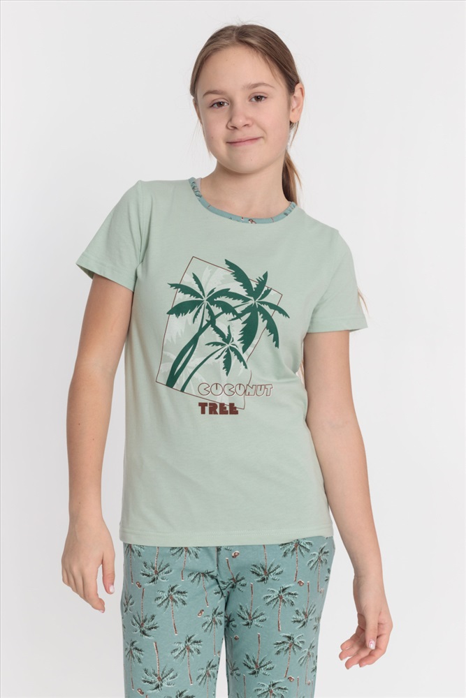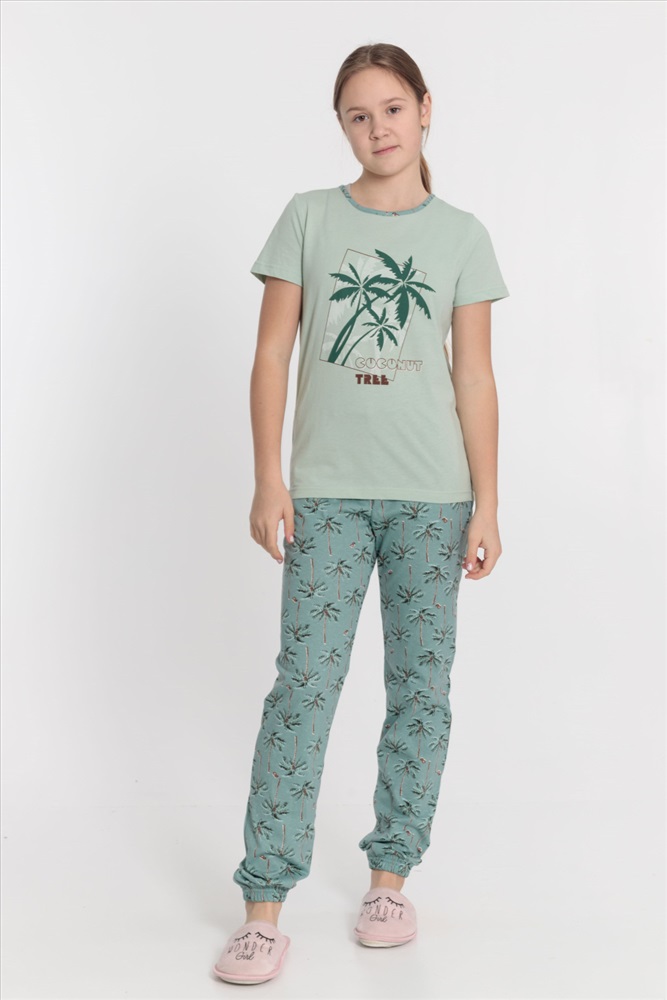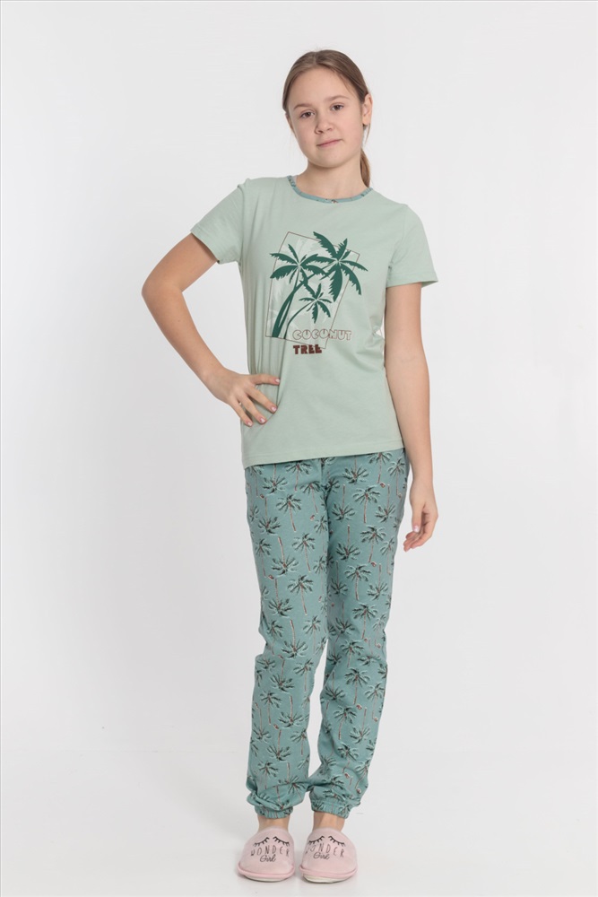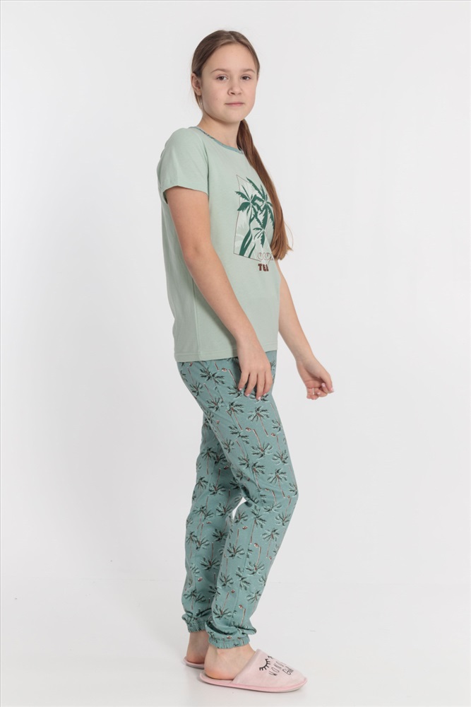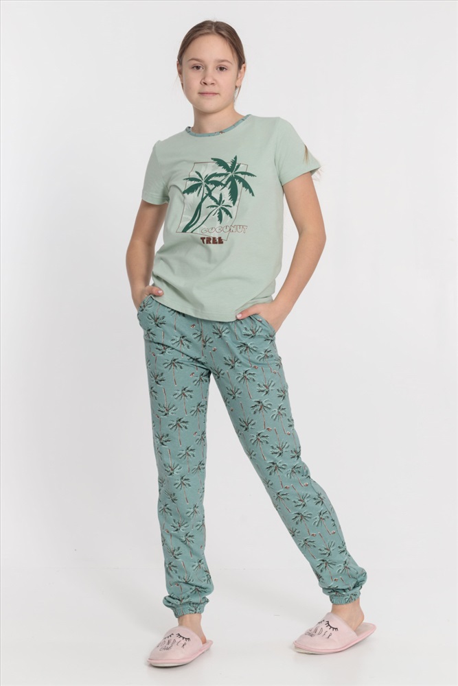 Вид верха комплекта: Футболка Вид низа комплекта: Брюки Вид ткани: Кулирка Сезон: Всесезонный Состав: Хлопок 100% Цвет Номенклатуры: шалфей