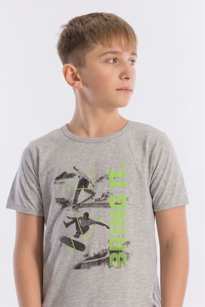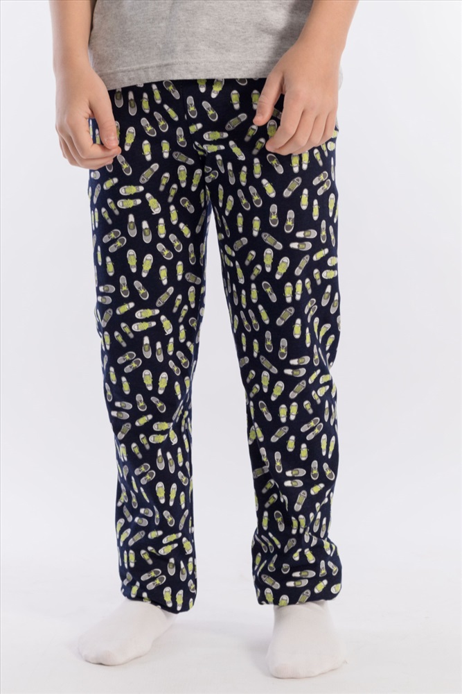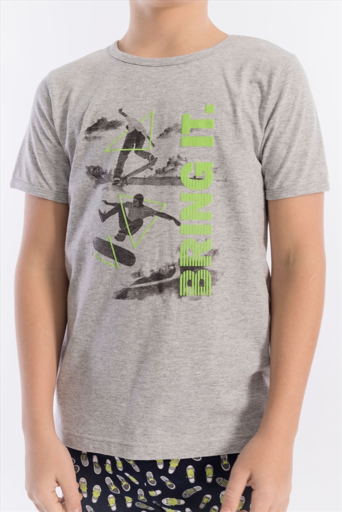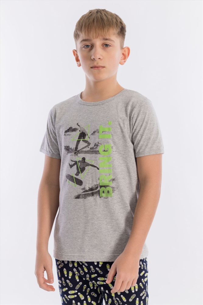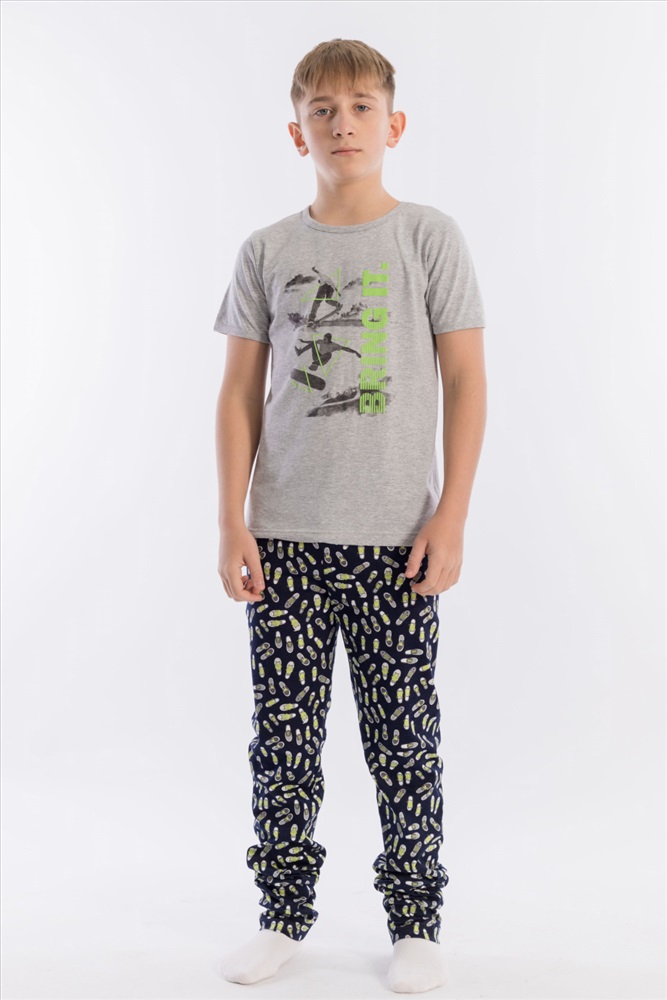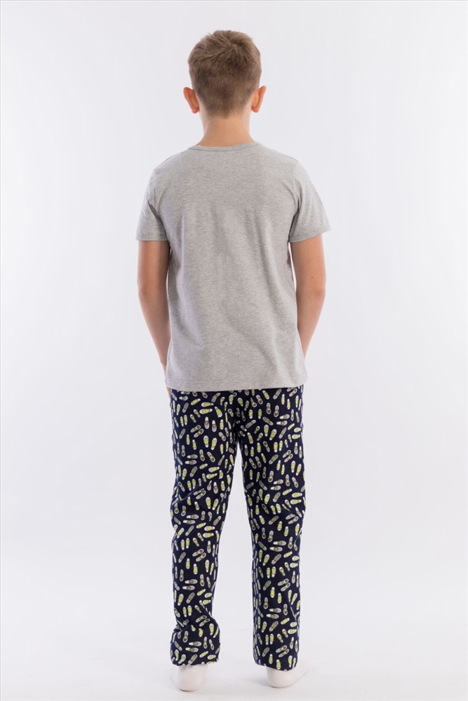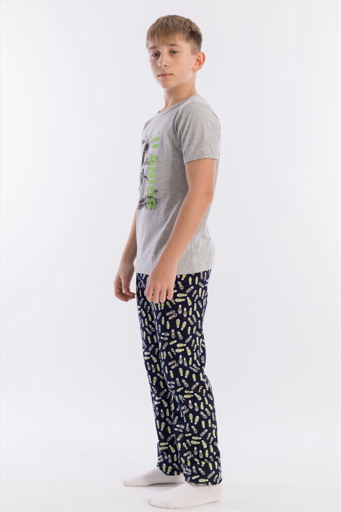 Вид низа комплекта: Брюки Вид ткани: Кулирка Сезон: Всесезонный Состав: Хлопок 100% Цвет Номенклатуры: меланж Пижама выполнена из хлопкового полотна, состоит из брюк и футболки. Пояс брюк на резине. Футболка однотонная, с коротким рукавом и круглым вырезом горловины, оформленным бейкой. Спереди нанесён принт. Комментарии к товару