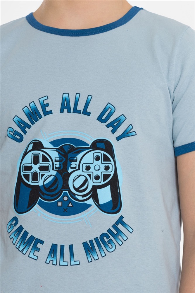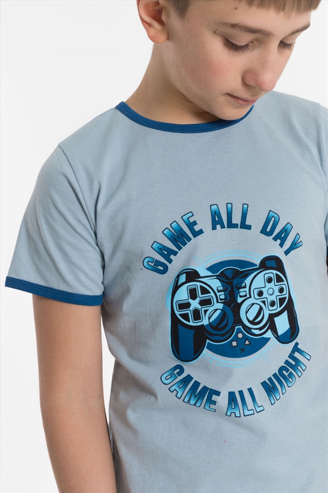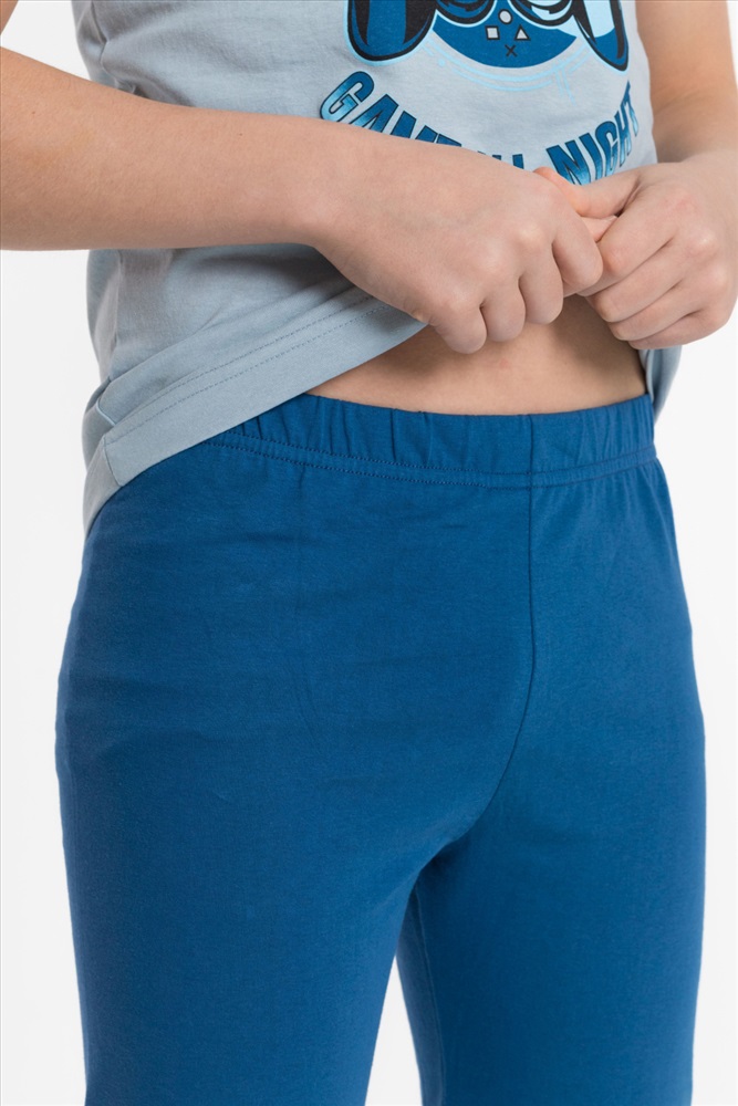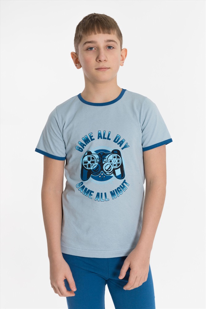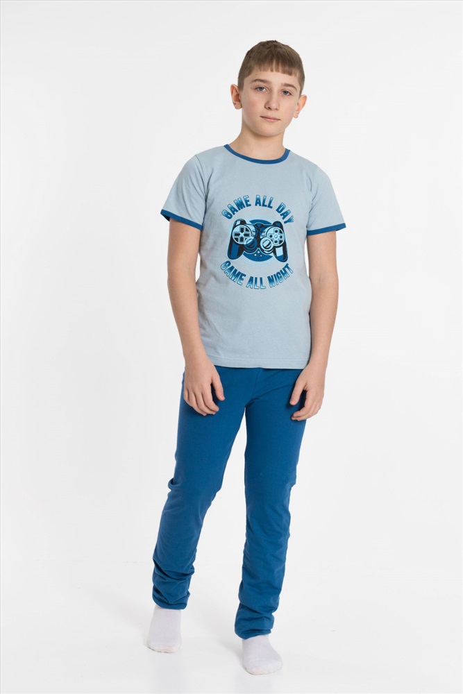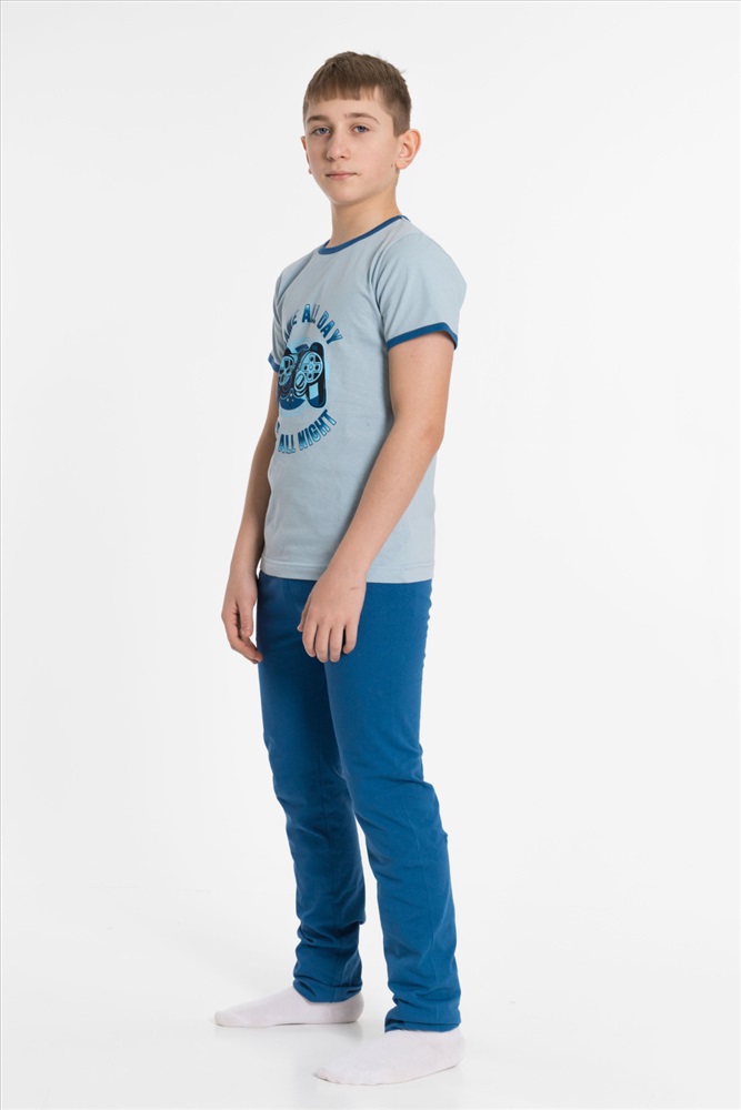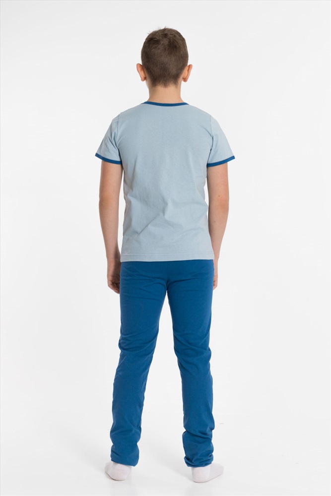 Вид низа комплекта: Брюки Вид ткани: Кулирка Сезон: Всесезонный Состав: Хлопок 100% Цвет Номенклатуры: серо-голубой Пижама детская из 100 х/б полотна. Футболка - круглый вырез горловины, принт. Брюки - прямого кроя, эластичные Комментарии к товару