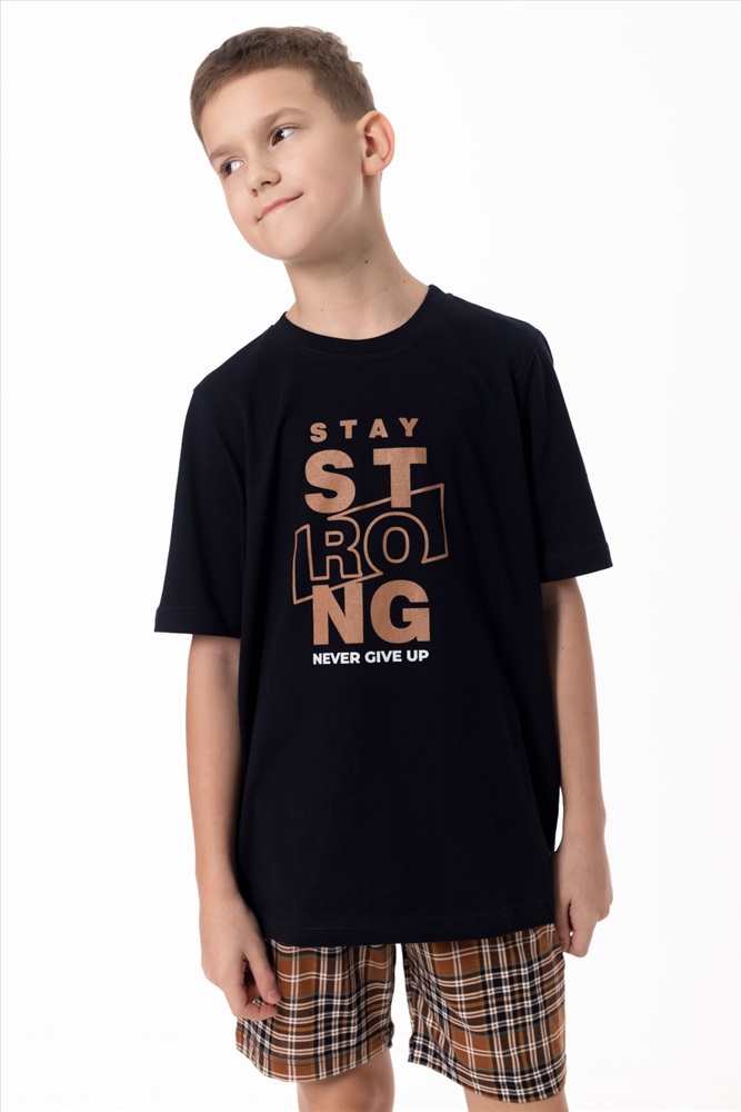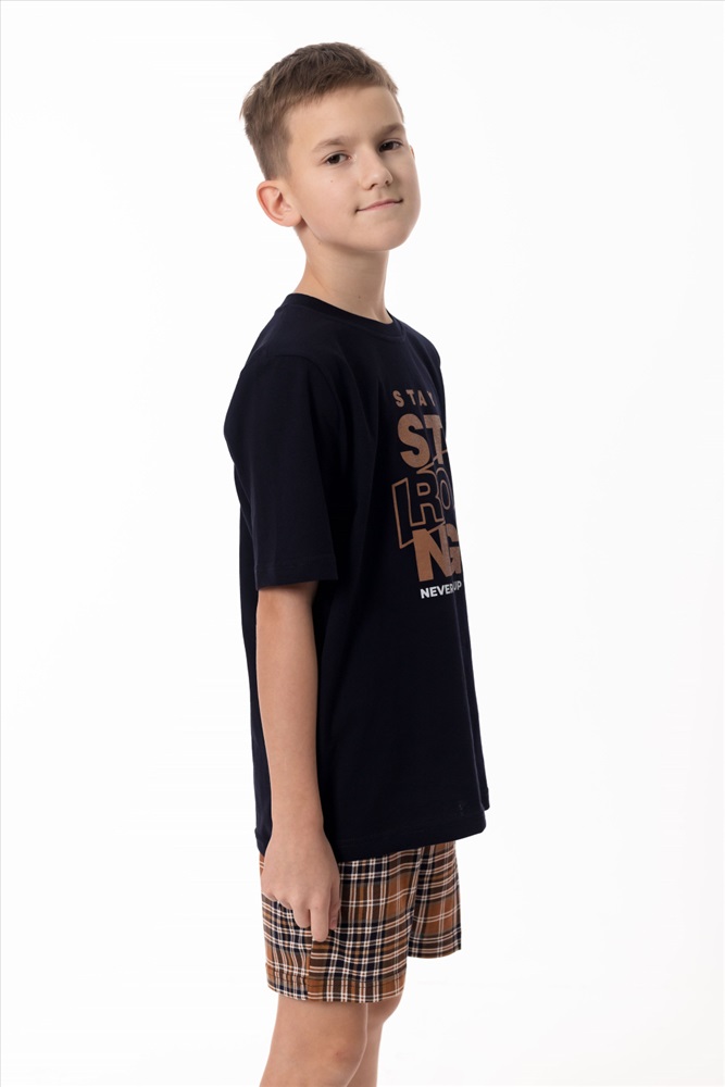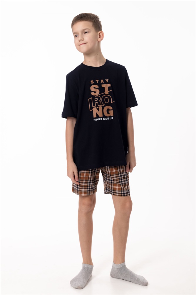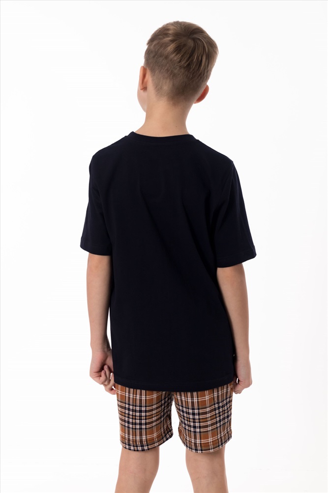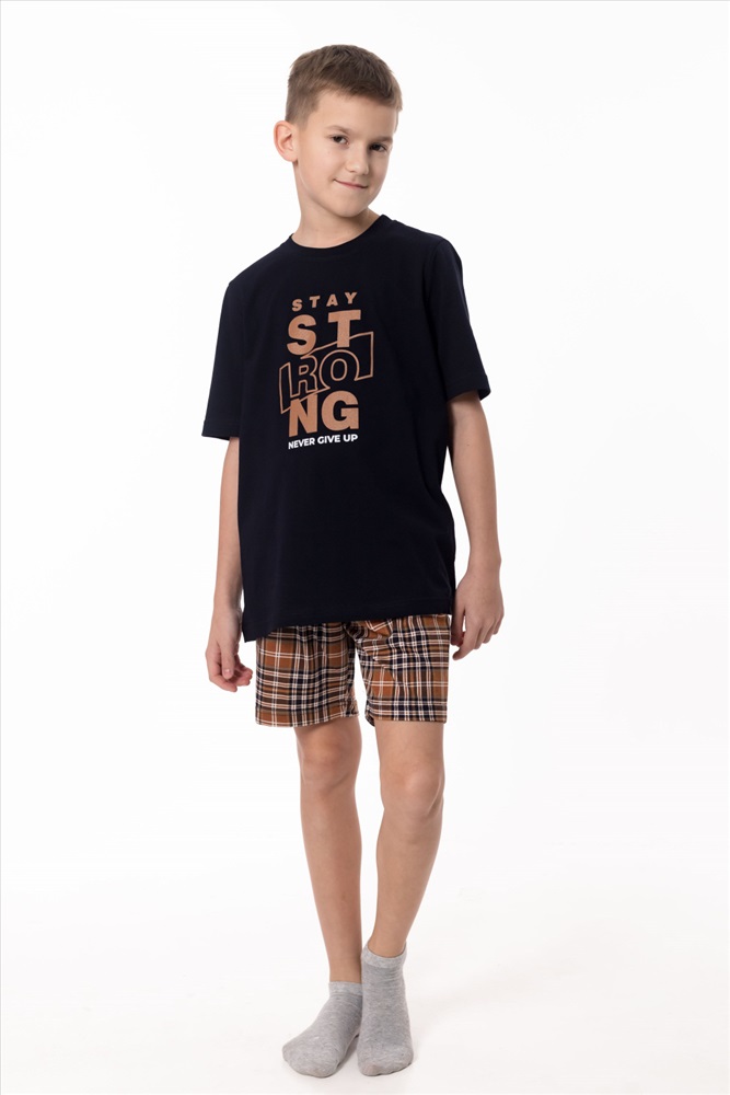 Вид верха комплекта: Футболка Вид низа комплекта: Шорты Вид ткани: Кулирка Сезон: Всесезонный Состав: Хлопок 100% Цвет Номенклатуры: синий/коричневый