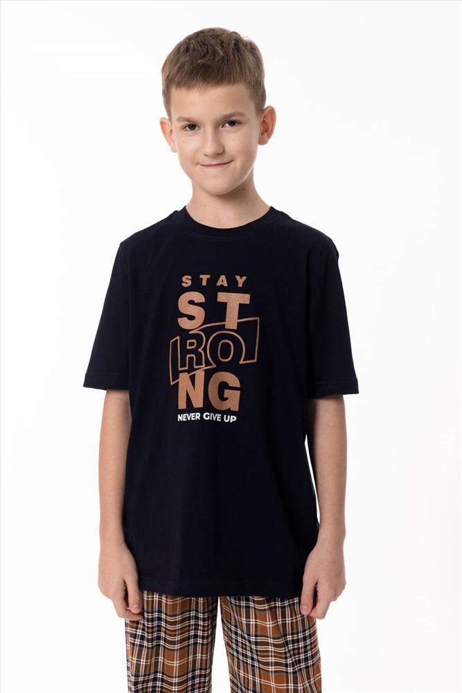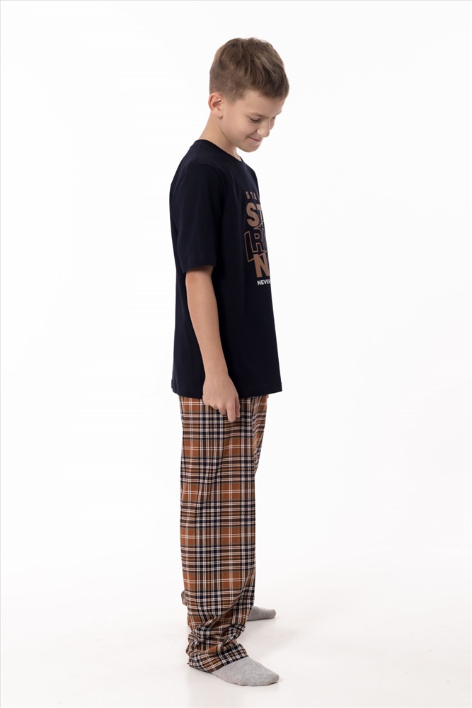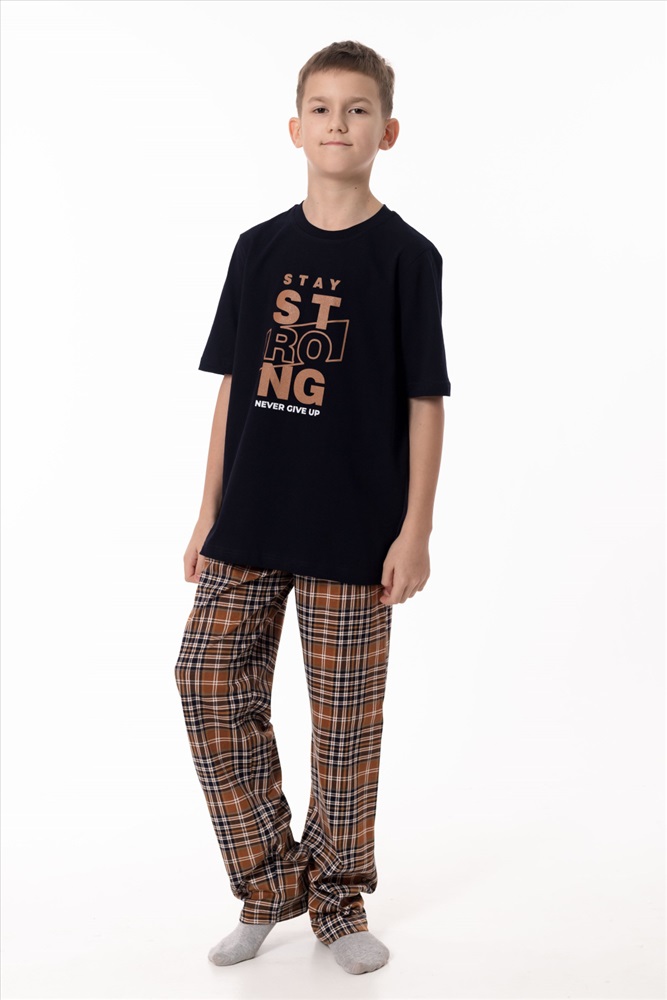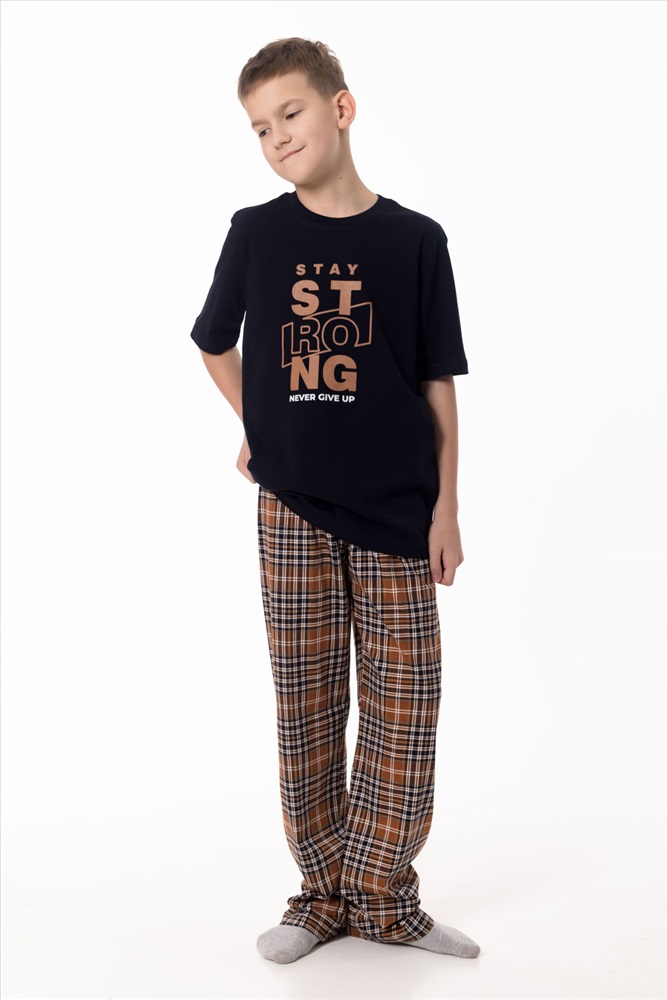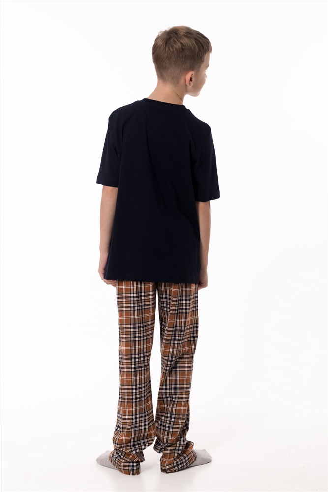 Вид низа комплекта: Брюки Вид ткани: Кулирка Сезон: Всесезонный Состав: Хлопок 100% Цвет Номенклатуры: синий/коричневый Пижама выполнена из натурального хлопкового полотна, обеспечивающего комфорт и приятные ощущения во время сна и отдыха. Комплект состоит из удобных брюк в клетку с эластичным поясом и однотонной футболки с коротким рукавом. Круглый вырез горловины аккуратно оформлен бейкой, а спереди расположен принт, придающий модели аккуратный и уютный акцент. Пижама отлично подойдёт для комфортного домашнего отдыха и спокойного сна. Комментарии к товару