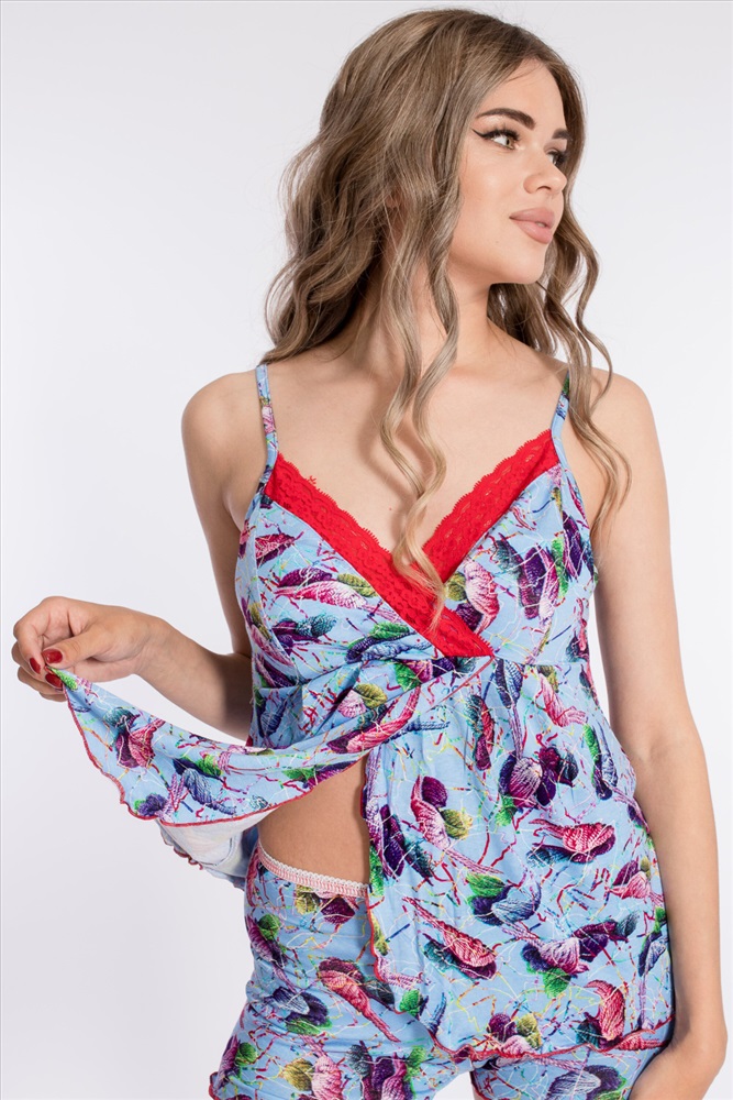 Пижама выполнена из вискозы, состоит из шорт и топа. Топ на тонких бретелях, срезы чашечек украшены кружевом, нижняя часть полочки на запах. По поясу шорт декоративная резинка.