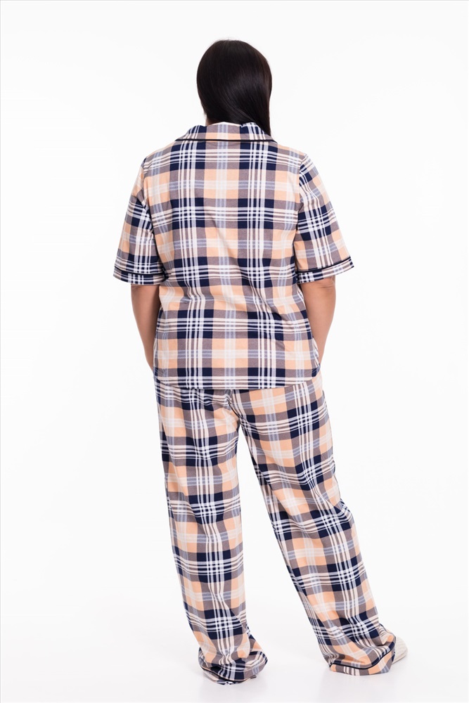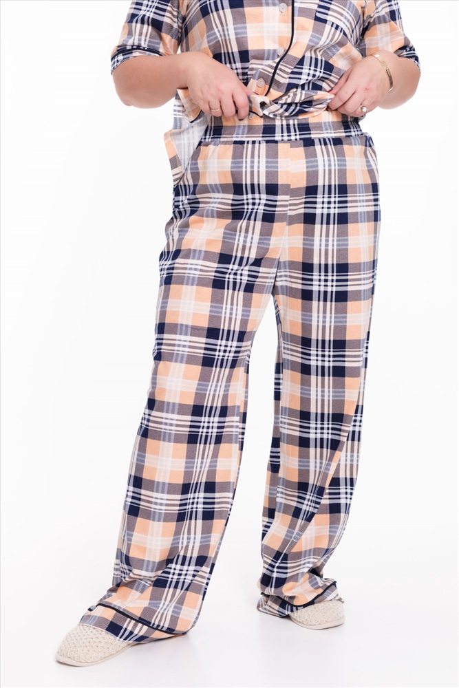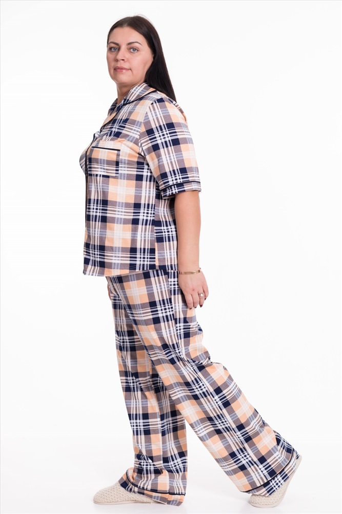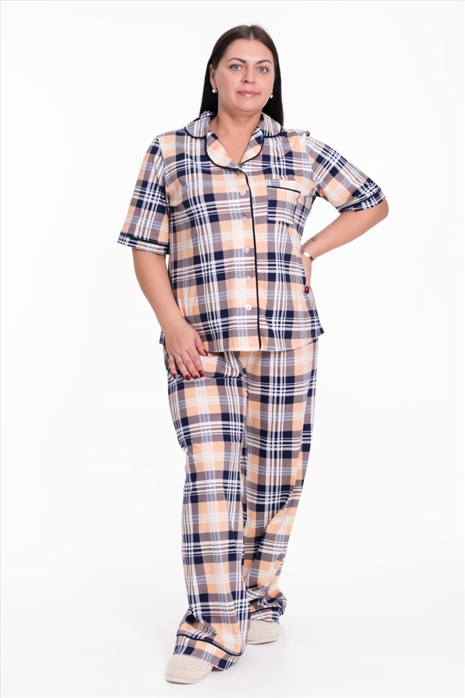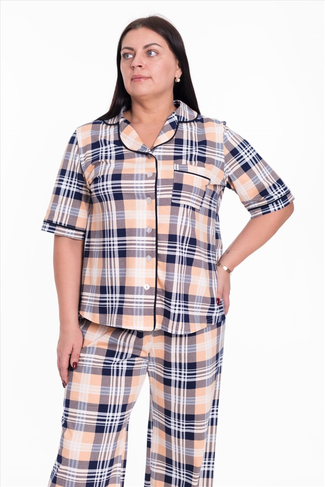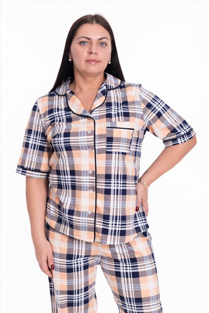 Вид низа комплекта: Брюки Вид ткани: Кулирка Сезон: Всесезонный Состав: Хлопок 100% Цвет Номенклатуры: бежевый/синий Женская пижама выполнена из кулирки, 100% хлопок. Рубашка с отложным воротником, коротким рукавом и карманом спереди. Рубашка застёгивается на пуговицы. Брюки свободные, с притачным поясом на резине. Рубашка и брюки украшены декоративным элементом - кантом. Комментарии к товару