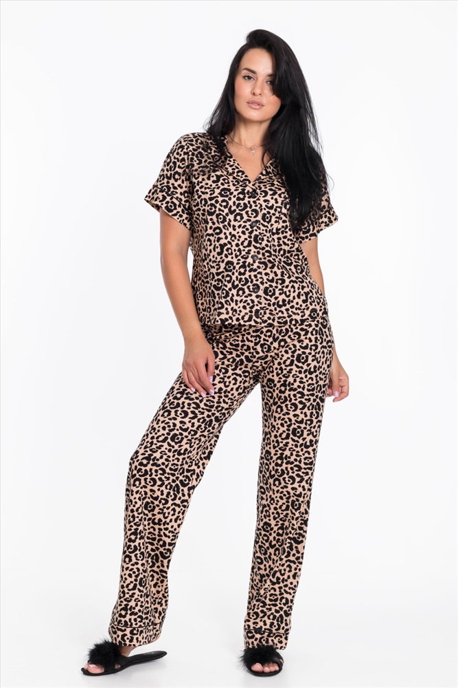Женская пижама рубашка и брюки изготовлена из мягкой и приятной к телу ткани — кулирки реактив в бежевом цвете с набивным рисунком леопард.