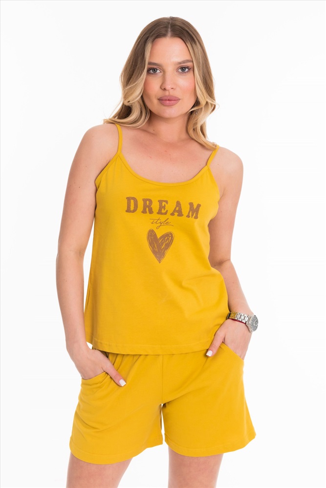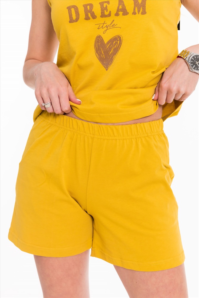 Женская пижама из кулирки в горчичном цвете - это стильно и удобно. Топ с тонкими бретелями в сочетании с шортами короткого покроя создадут легкий и комфортный образ для отдыха. Расположенный спереди принт придает изделию индивидуальность и интересный вид. Короткие шорты с поясом на резинке и карманами обеспечат хорошую посадку и удобство. Горчичный цвет и стильный дизайн делают эту пижаму привлекательной и модной.