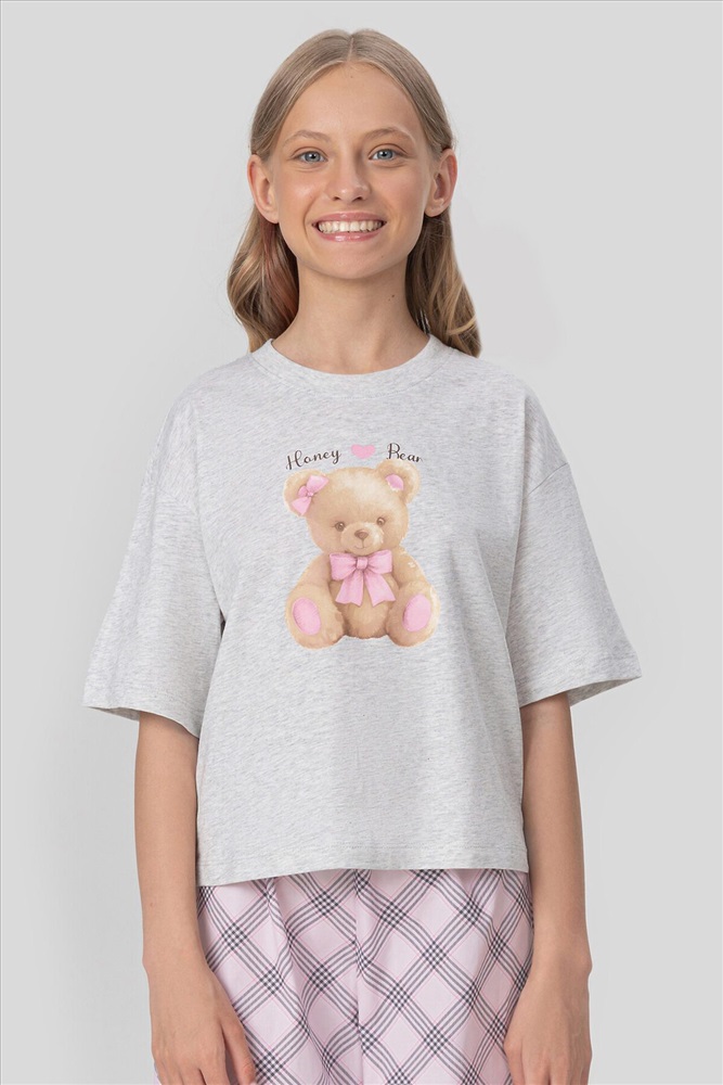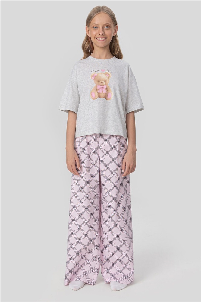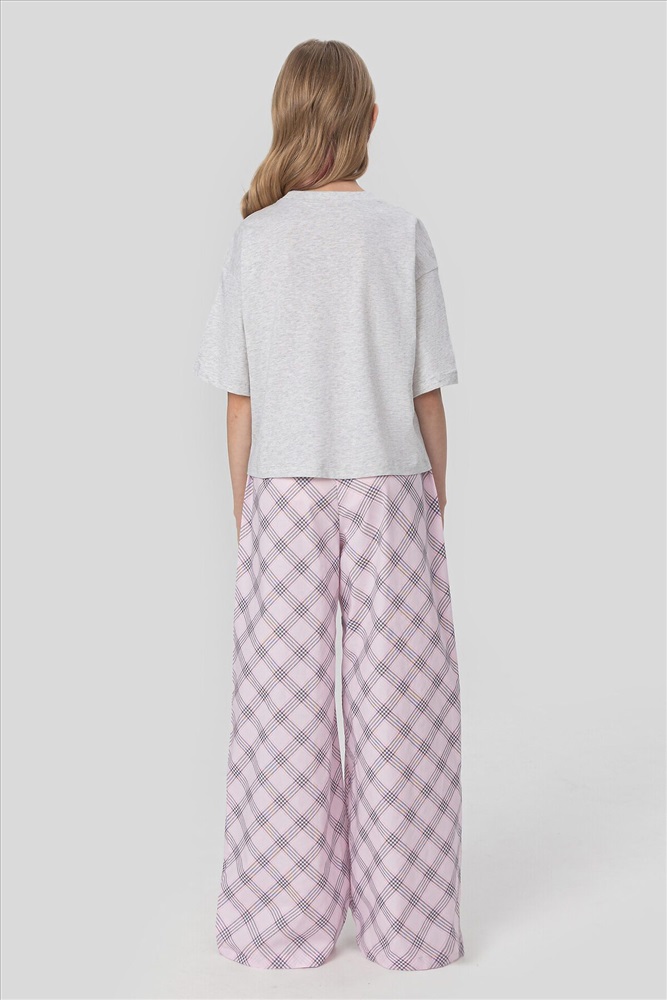 Футболка свободного силуэта. Горловина круглой формы, обтачка из рибаны. Рукава втачные свободные, линия плеча слегка спущена. Низ рукавов и футболки в подгибку. Брюки свободного силуэта. Пояс цельнокроеный внутри с резиной 40RV. Низ брюк в подгибку.