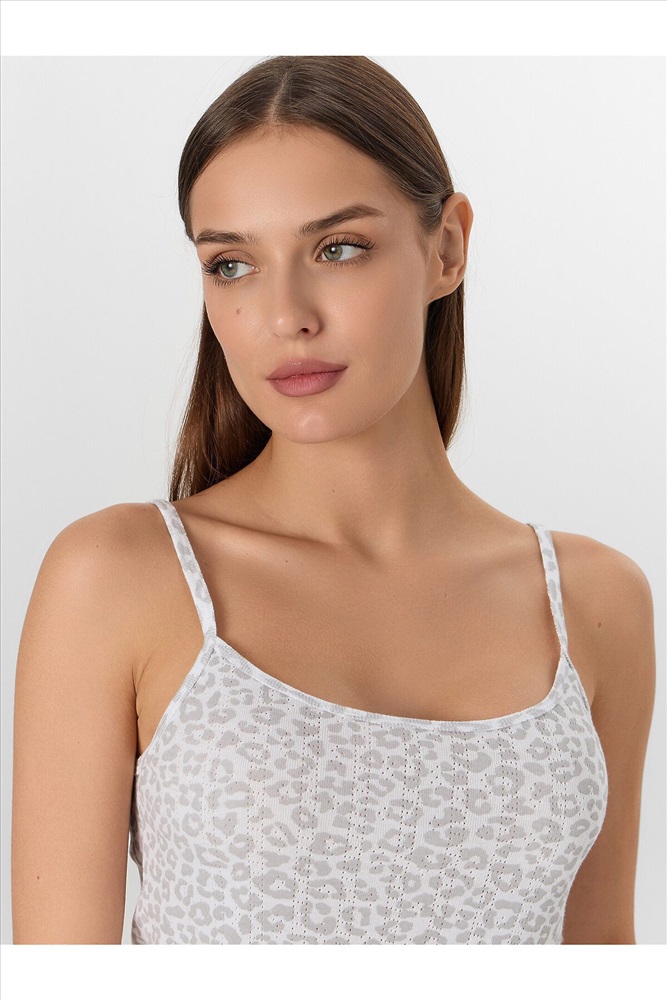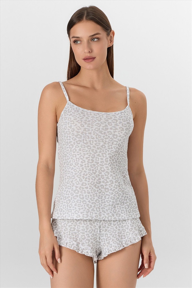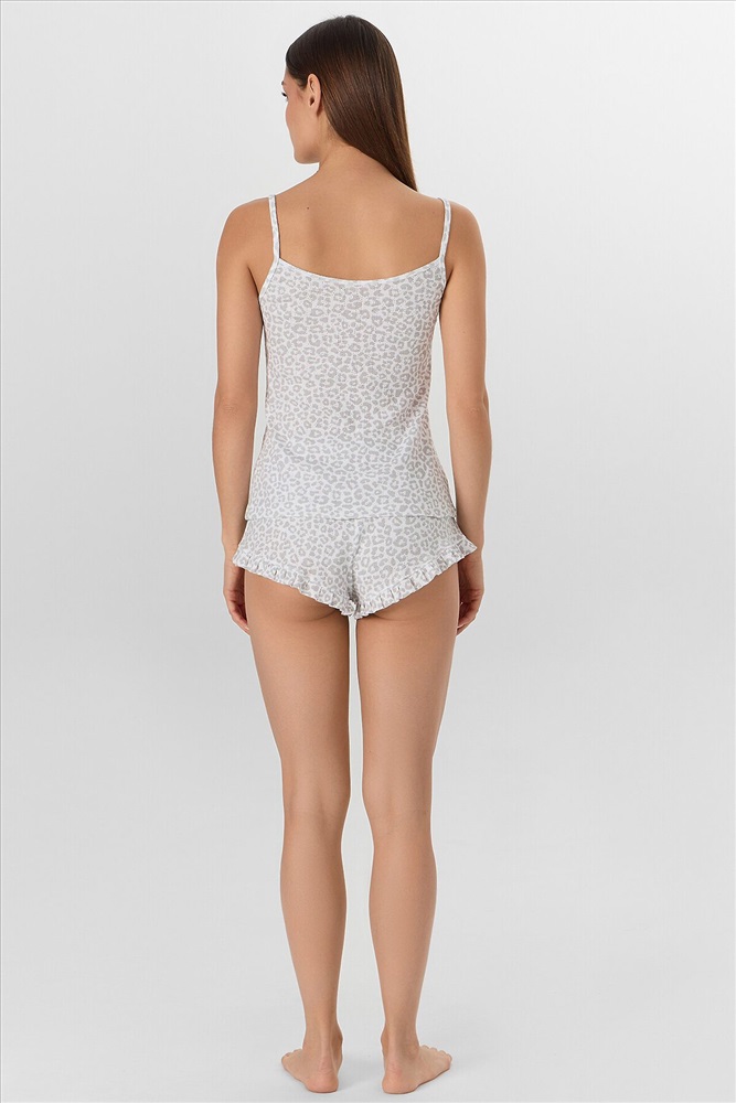 Топ прилегающего силуэта. Перед и спинка цельнокроеные. Горловина U-образной формы, окантована бейкой. Спинка и пройма окантована бейкой, переходящей в бретель, в бретелях жилка тканая 8мм девсел 13460W, WT4-8. Низ майки обработан в подгибку. Шорты полуприлегающие, короткие. Пояс цельнокроеный, с втачной эластичной тесьмой 20RV. В шве сидения силиконовая лента 6 мм, Si1-6. Низ шорт обработан отрезными рюшами.