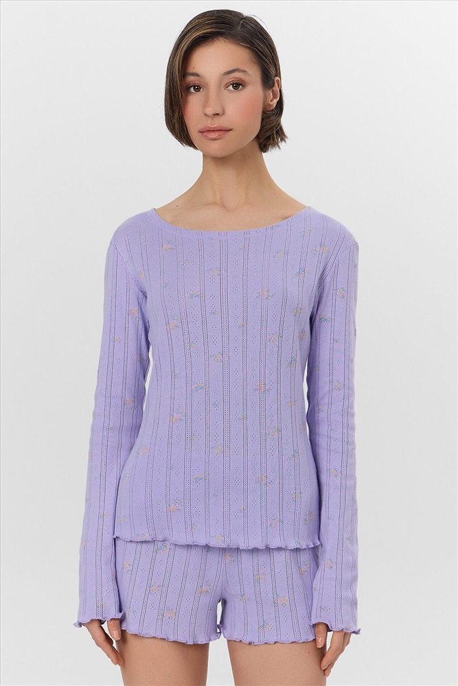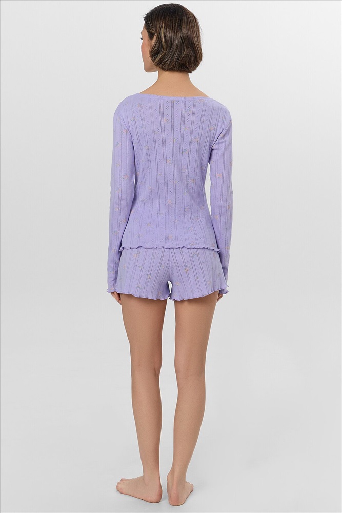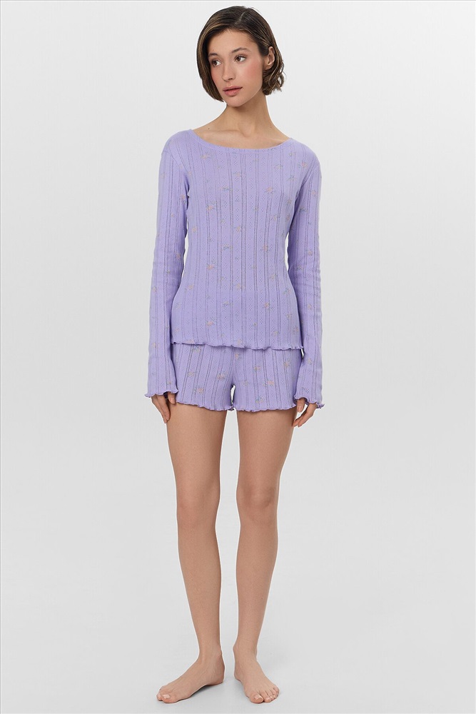 Джемпер полуприлегающего силуэта, чуть приталенный. Перед и спинка цельнокроеные. Горловина овальной форсы, обработана в подгибку. Рукава втачные, длинные. Низ изделия и рукавов обработаны на микрооверлоке. Шорты полуприлегающего силуэта, с посадкой на талии. Пояс цельнокроеный с резиной внутри 20 RV. Низ изделия обработан на микрооверлоке.