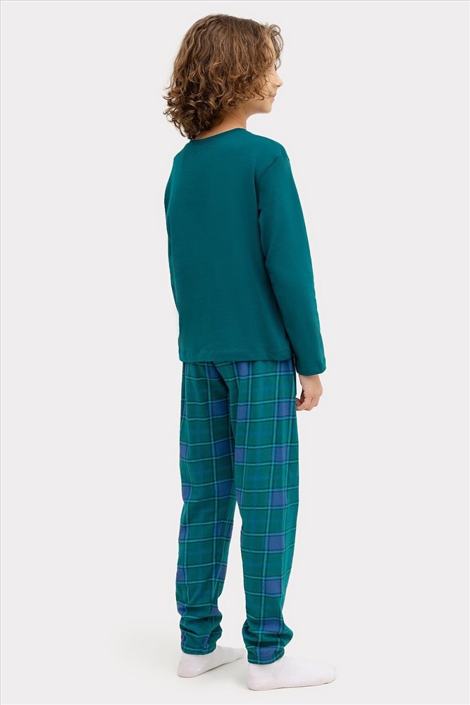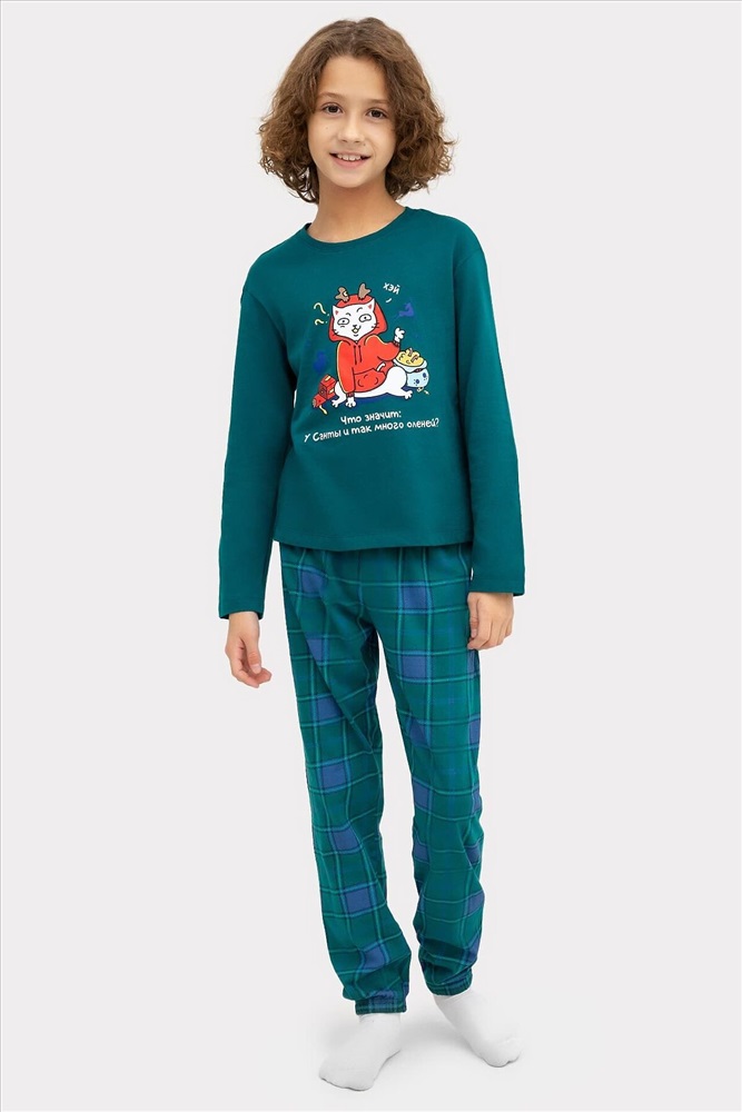 Комплект для мальчиков состоит из джемпера и брюк. Горловина круглой формы с притачной обтачкой из основного полотна. Рукава длинные втачные. Перед и спинка цельнокроеные. Низ джемпера и рукавов обработан швом в подгибку. Брюки длинные, немного заужены к низу. Пояс цельнокроенный с эластичной тесьмой внутри. Низ брюк застрочен с эластичной тесьмой внутри.
