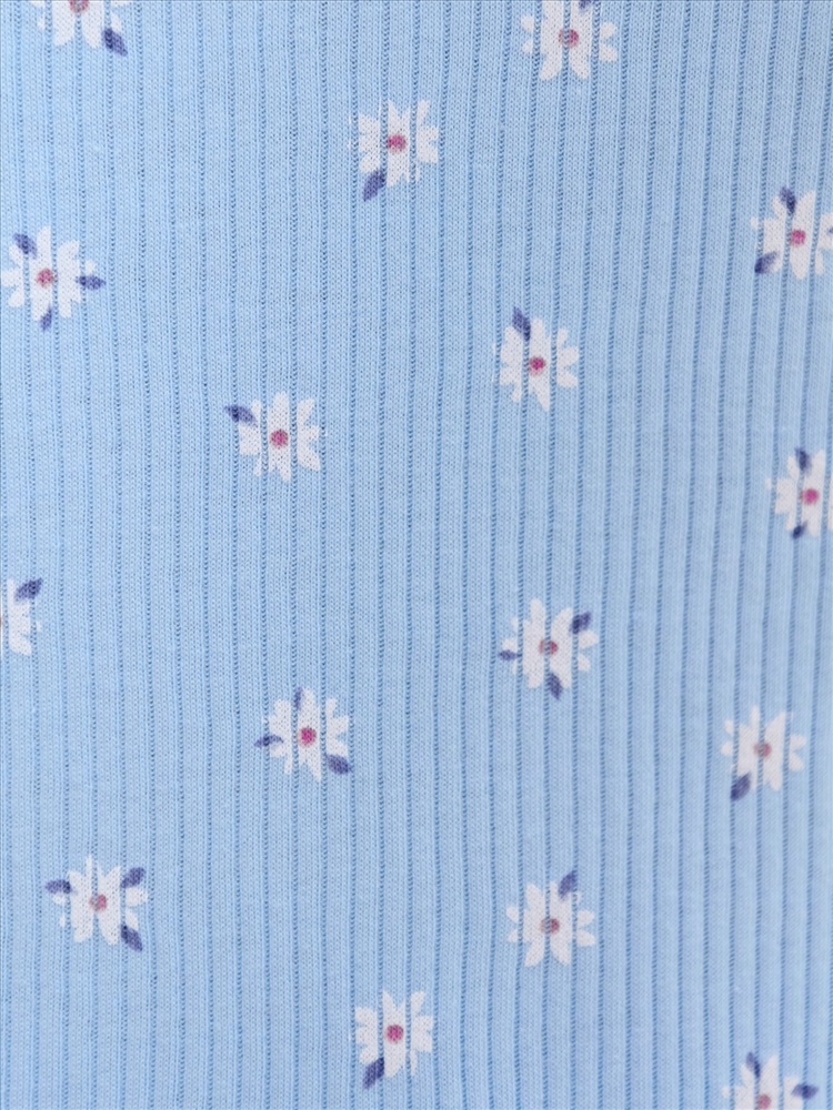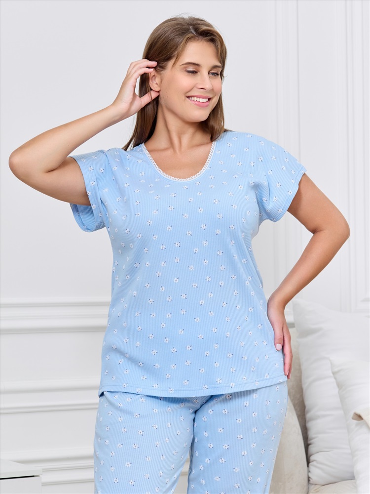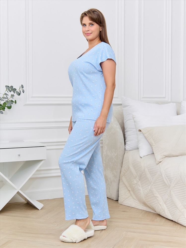 Пижама женская из трикотажного полотна «кашкорсе» с набивным рисунком, состоящая из футболки и брюк.Футболка - классического покроя с углубленной формой горловины, обработанной эластичной тесьмой с фасонным краем и цельнокроеными рукавами.Брюки – длинные, свободные, с эластичной тесьмой по талии.