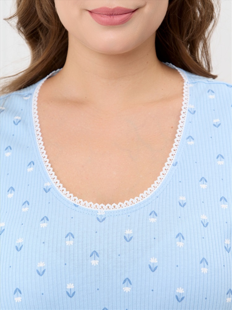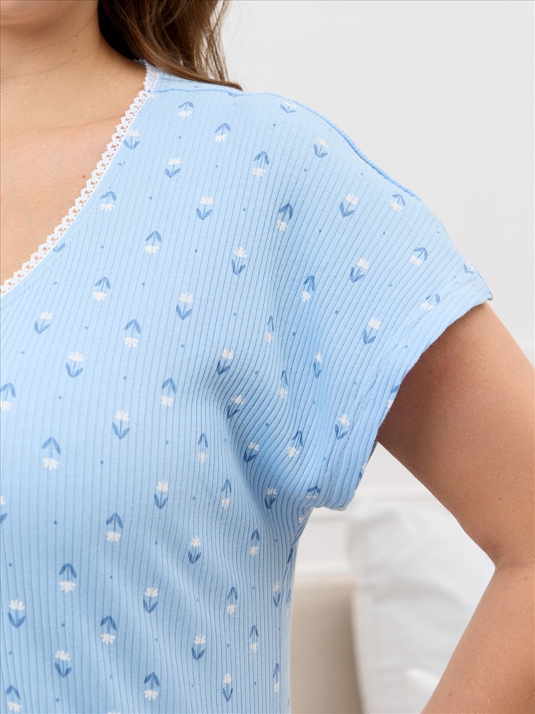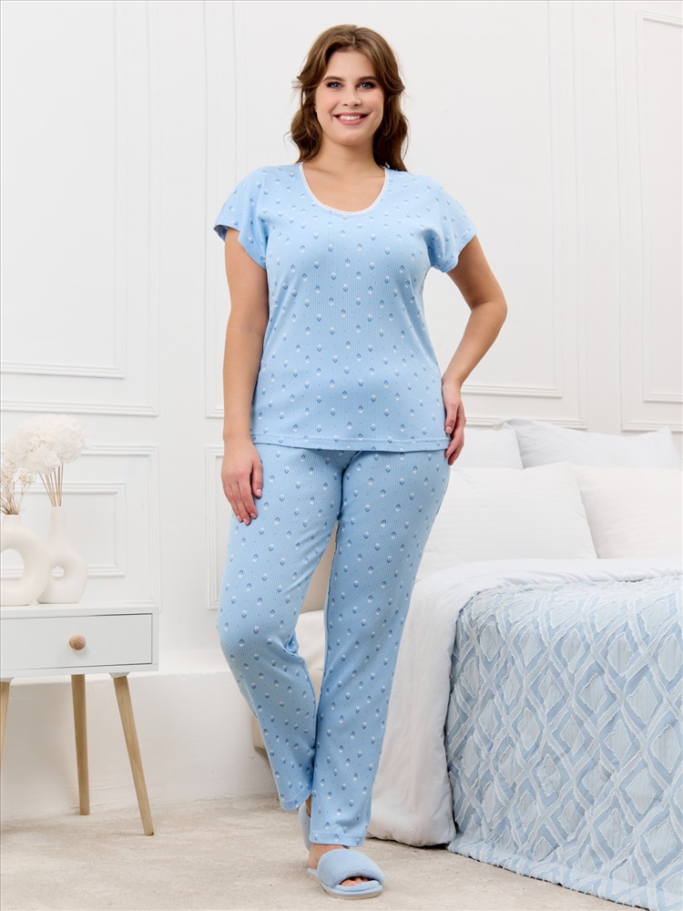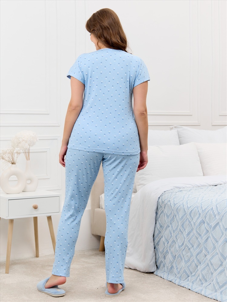 Состав: 95% хлопок, 5% лайкра Ткань: Кашкорсе Пижама женская из трикотажного полотна «кашкорсе» с набивным рисунком, состоящая из футболки и брюк.Футболка - классического покроя с углубленной формой горловины, обработанной эластичной тесьмой с фасонным краем и цельнокроеными рукавами.Брюки – длинные, свободные, с эластичной тесьмой по талии.