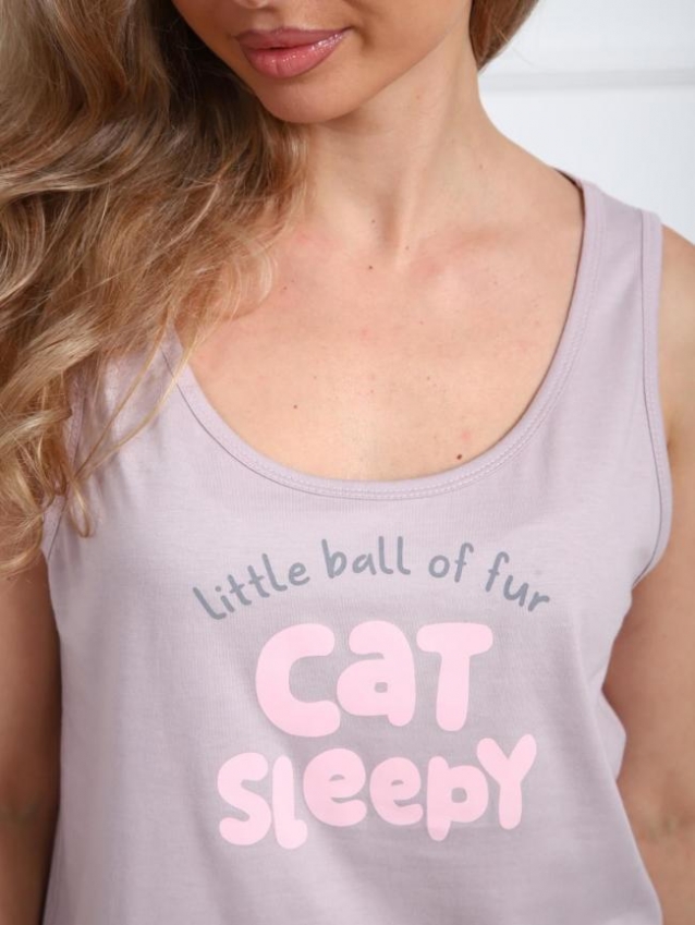 Пижама "Милота" из трикотажного полотна "кулирка" состоит из майки и шорт. Майка из гладкокрашеного трикотажного полотна "кулирка" полуприлегающего силуэта с круглым вырезом горловины на широких бретелях. Вырез горловины и проймы обработаны кантом из основной ткани. Майка украшена модным принтом. Шорты из трикотажного полотна с набивным рисунком, на притачном поясе с эластичной лентой и карманами в боковых швах. Комментарии к товару