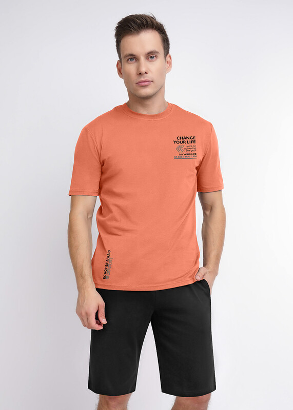 Футболка свободного покроя с круглым вырезом, на глади с авторским прином. Шорты комфортной посадки с поясом на внутренней резинке с карманами, кант сбоку по всей длине шорт в цвет футболки.