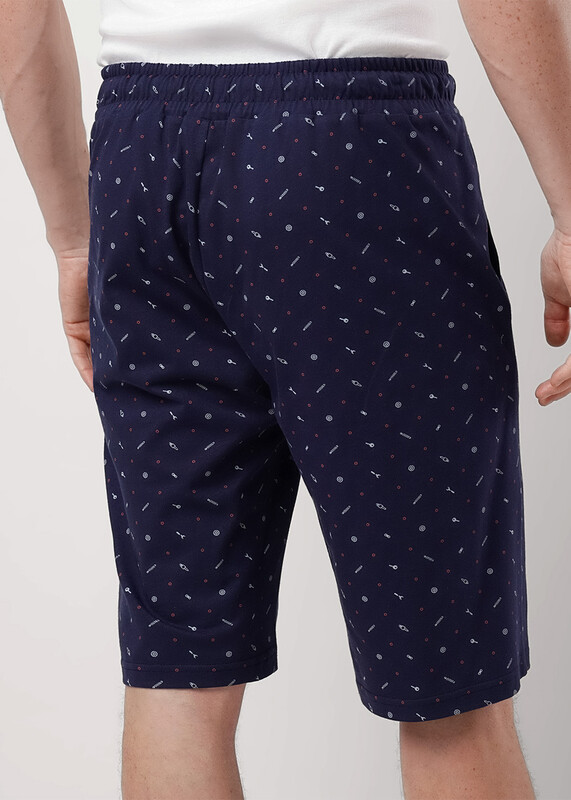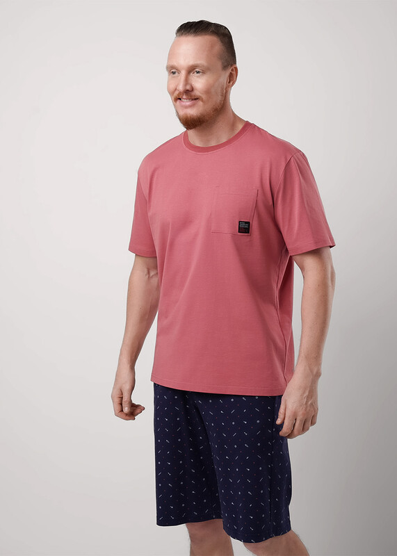 Комплект мужской для дома, состоящий из футболки и шорт. Футболка из трикотажного полотна с круглым вырезом горловины, коротким рукавом и карманом. Шорты из хлопкового полотна в набивку на эластичном поясе с функциональными карманами и шнуром.