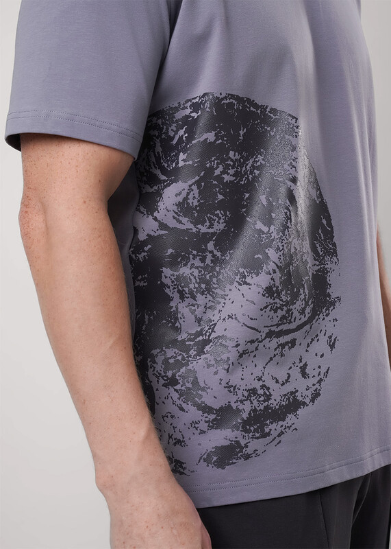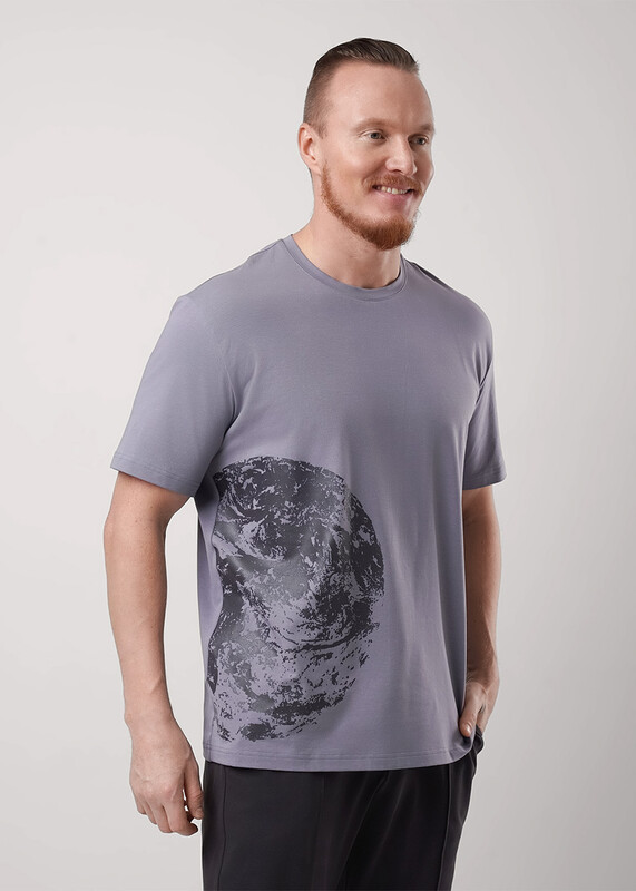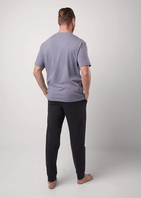 Комплект мужской, состоящий из футболки и брюк. Футболка из трикотажного полотна с коротким рукавом, спереди авторский принт. Брюки с защипами из трикотажного полотна на широком поясе с резинкой и регулируемым шнуром, по бокам удобные карманы.