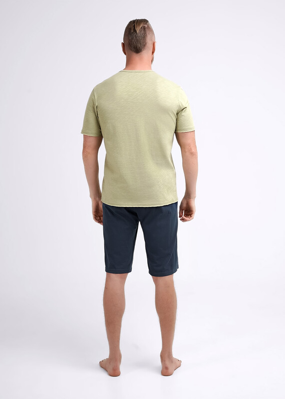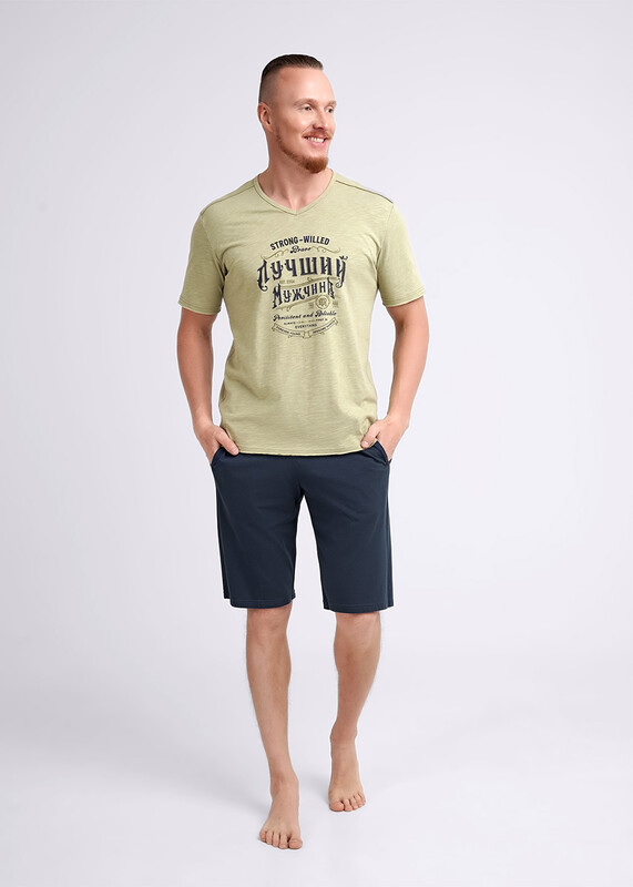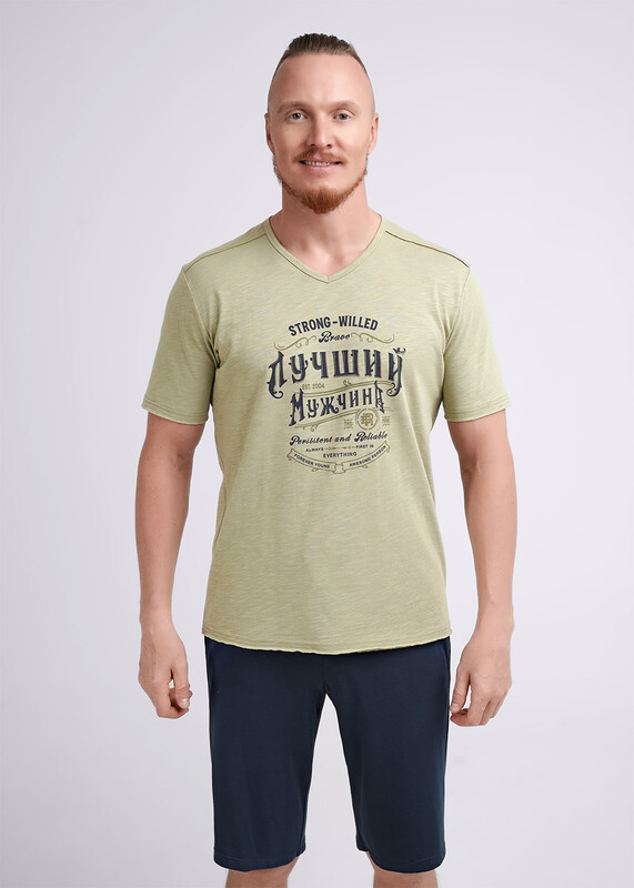 Комплект мужской для дома состоящий из футболки и шорт. Футболка с V-образной горловиной, из фактурного хлопкового полотна. Оригинальности модели придают открытые срезы и принт. Шорты из трикотажа на поясе с резинкой, шнуром и карманами.