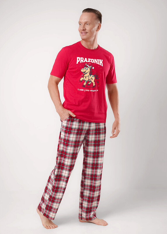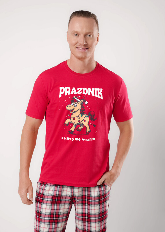 Набор мужской, состоящий из футболки и брюк. Футболка из хлопковой кулирной глади с коротким рукавом , спереди авторский принт. Брюки из клетчатой кулирной глади с карбоном на широком поясе с резинкой и шнуром, по бокам удобные карманы.