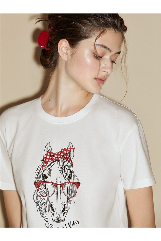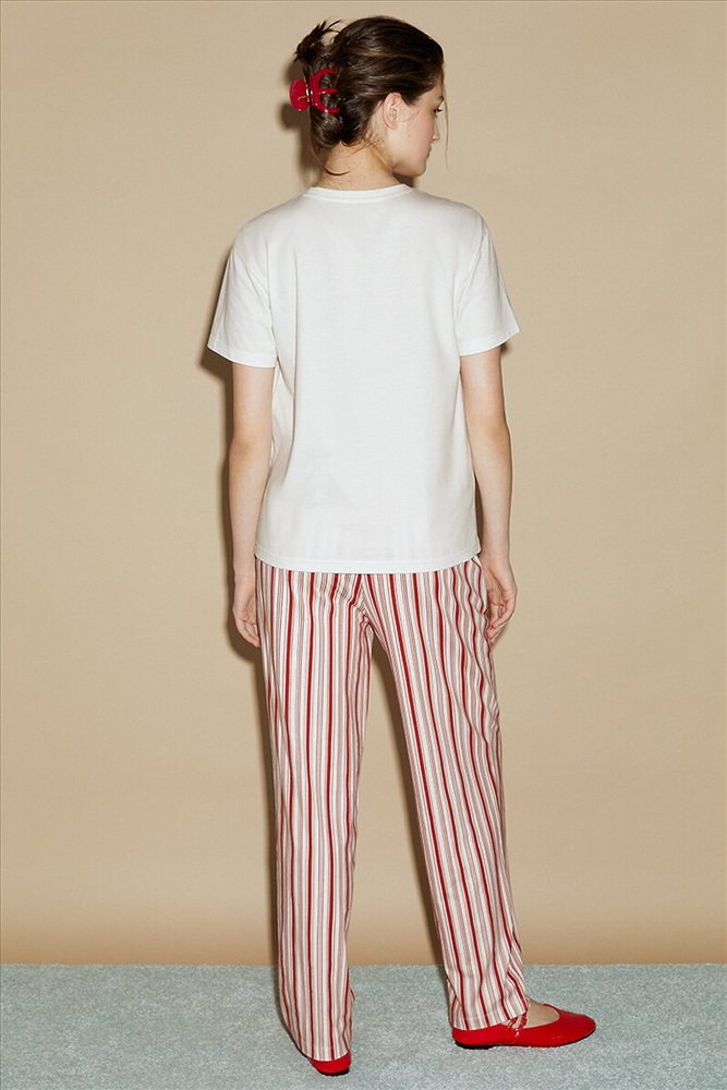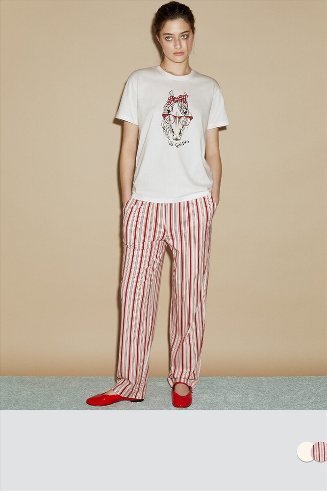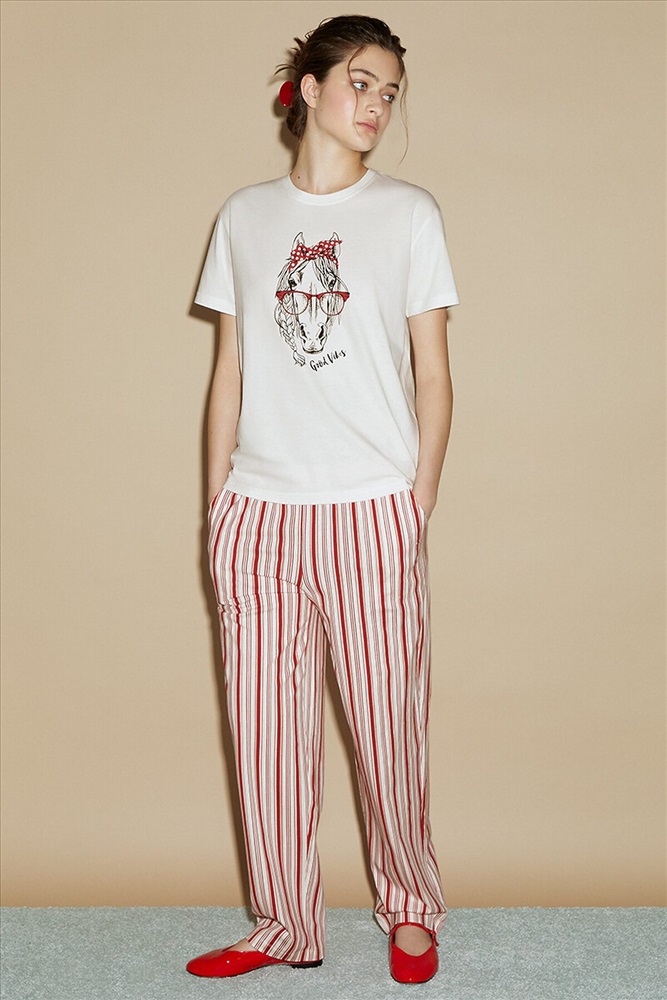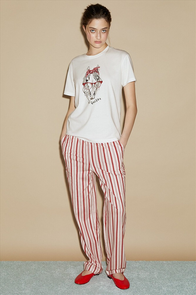 ID товара: 1199857 Состав: 100% Хлопок Сезон: Демисезон Длина: Полная Фасон: Свободный Рукав: короткие Декоративные элементы: Принт Основная ткань: Хлопок Страна бренда: Италия Страна производства: Китай Женская пижама с трендовым принтом: классическая футболка с коротким рукавом и круглым вырезом, а также прямые брюки с карманами и поясом на резинке. Изготовлена из 100% мягкого, гребенного хлопка, который отлично пропускает воздух, приятно ощущается на теле и подходит даже для самой чувствительной кожи.Стильная, комфортная и универсальная — идеально подходит для создания уютных домашних образов. Акцентный принт на футболке эффектно сочетается с красочной полоской на брюках. Комментарии к товару