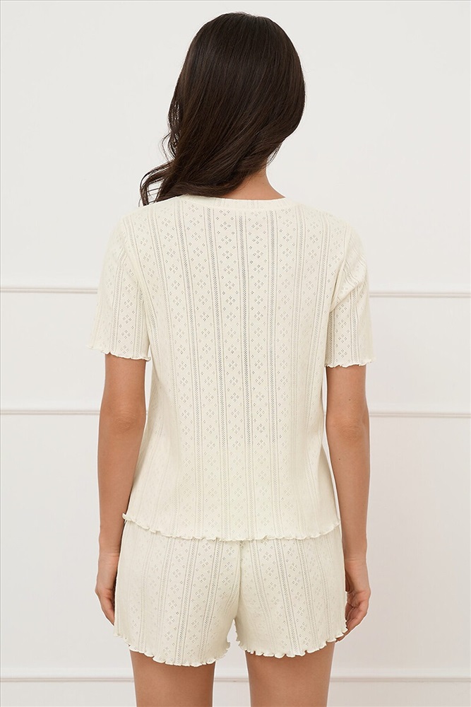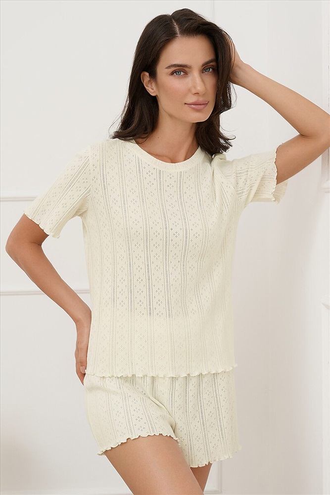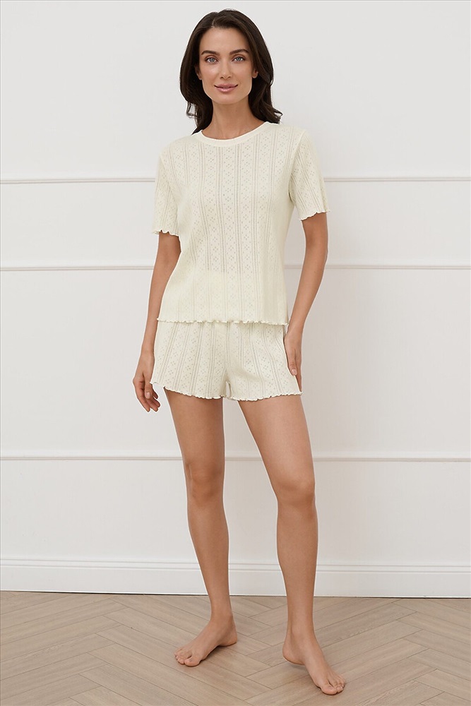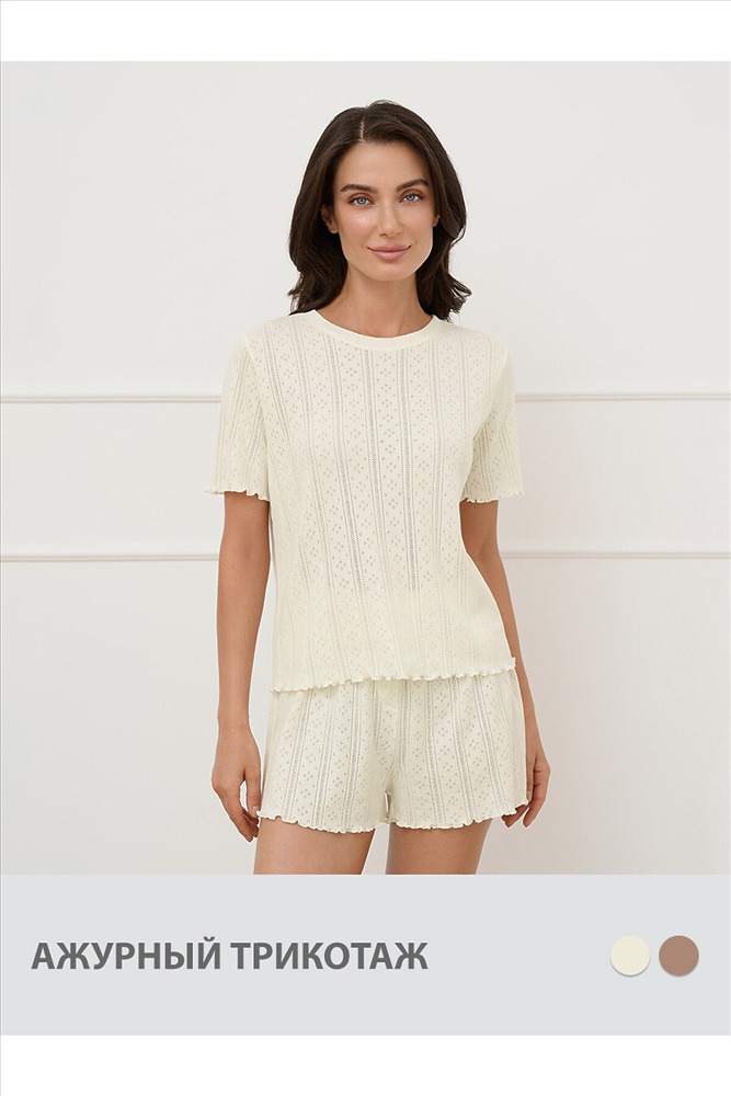 ID товара: 1211941 Состав: 100% Хлопок Сезон: Демисезон Длина: Средняя Фасон: Полуприлегающий Рукав: короткие Основная ткань: Хлопок Страна бренда: Италия Страна производства: Китай Женская пижама, состоящая из футболки и шорт. Комментарии к товару