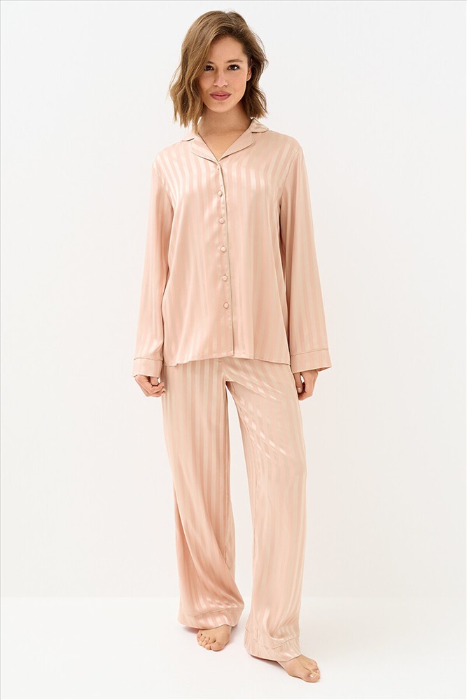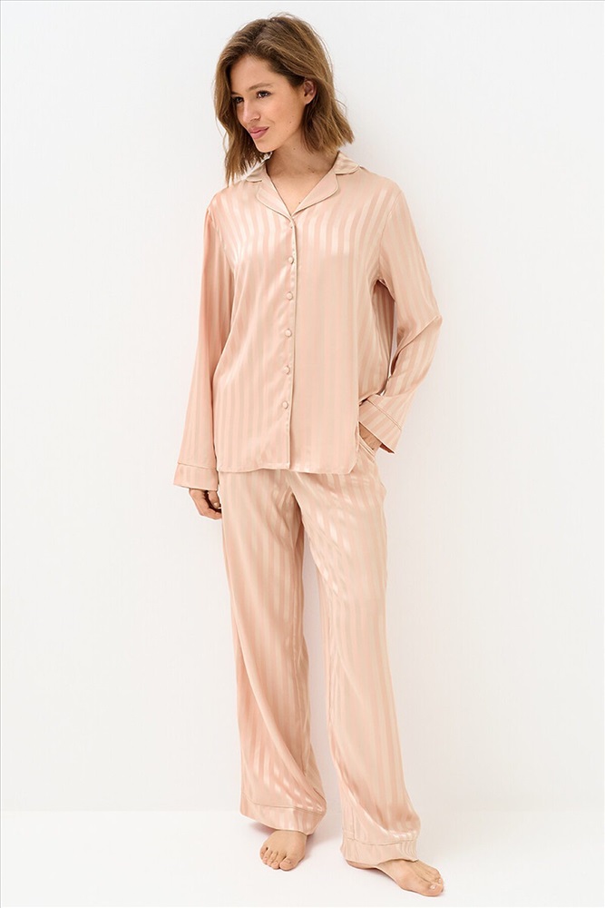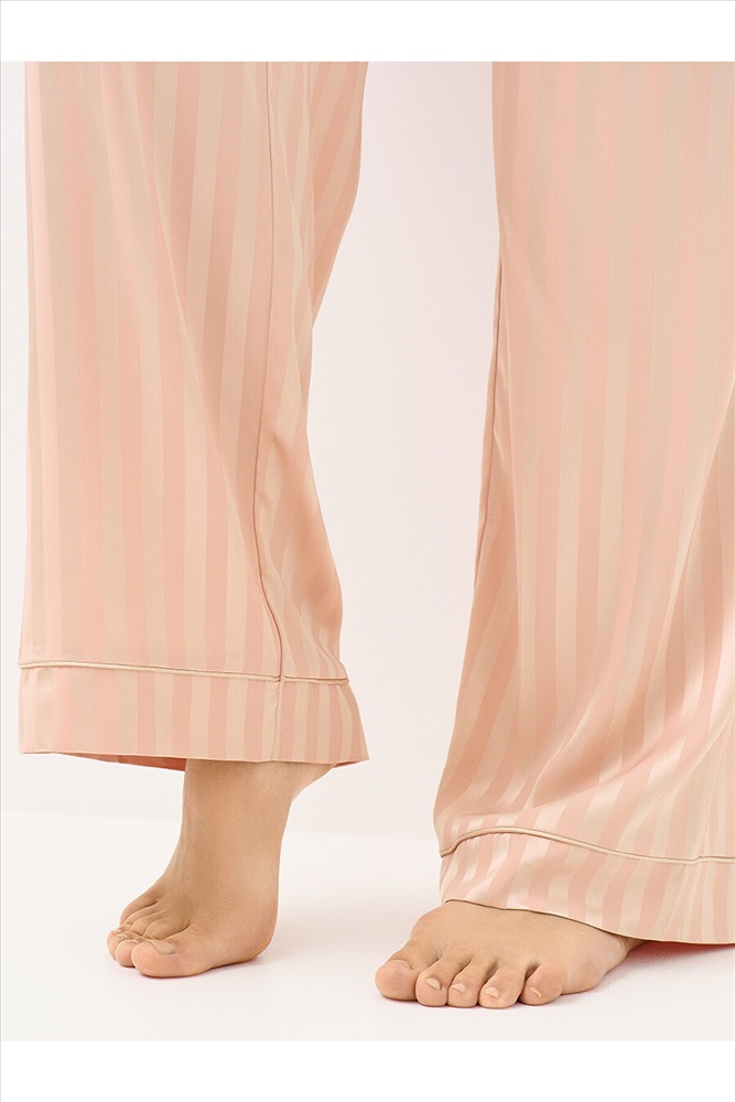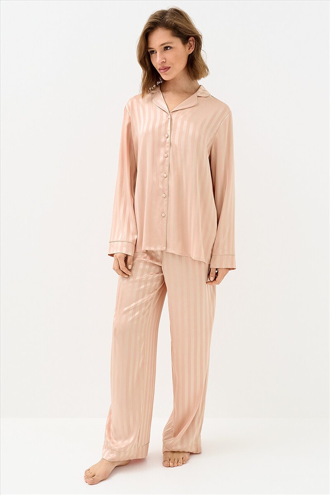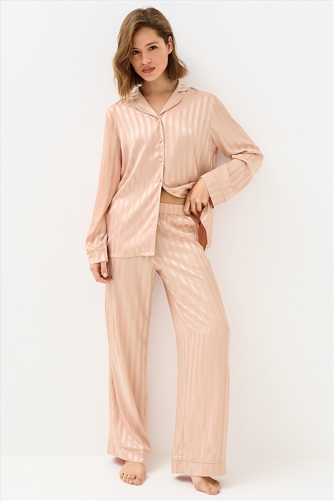 Женская пижама в полоску: рубашка на пуговицах с длинными рукавами и отложным воротником, с однотонным кантом и манжетами; прямые брюки с поясом на резинке, боковыми карманами и манжетами с однотонным кантом. Изготовлена из гладкого и лёгкого искусственного шёлка, который приятно ощущается на теле и хорошо сохраняет форму. Деликатная обработка краёв обеспечивает дополнительный комфорт. Воплощение элегантности в домашнем формате: расслабленный силуэт, благородное сияние ткани и лаконичный принт. Отлично подходит для дома и сна.
