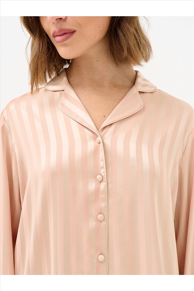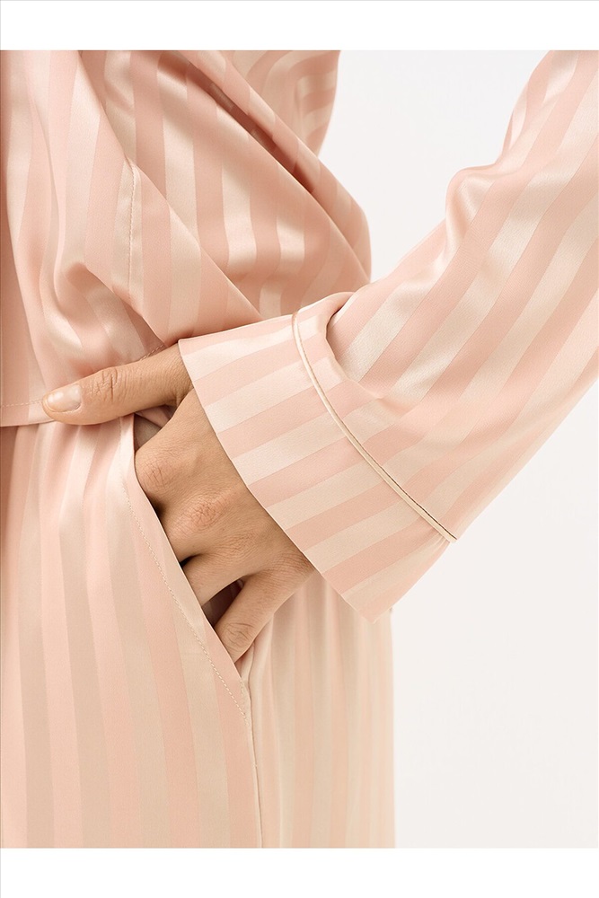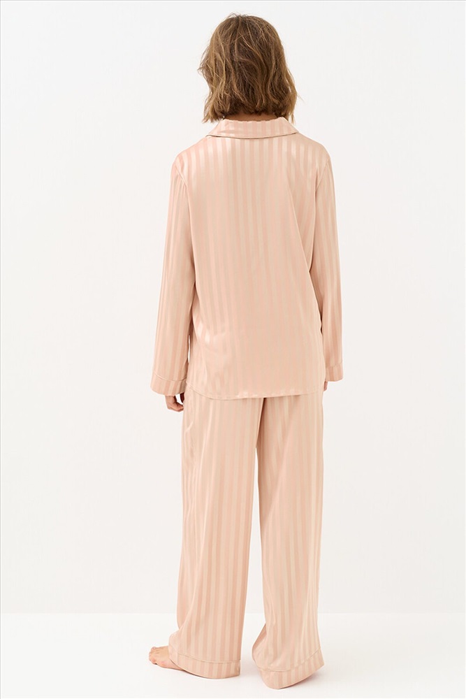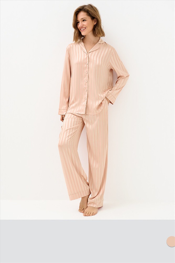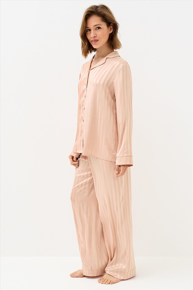 Женская пижама в полоску: рубашка на пуговицах с длинными рукавами и отложным воротником, с однотонным кантом и манжетами; прямые брюки с поясом на резинке, боковыми карманами и манжетами с однотонным кантом. Изготовлена из гладкого и лёгкого искусственного шёлка, который приятно ощущается на теле и хорошо сохраняет форму. Деликатная обработка краёв обеспечивает дополнительный комфорт. Воплощение элегантности в домашнем формате: расслабленный силуэт, благородное сияние ткани и лаконичный принт. Отлично подходит для дома и сна.