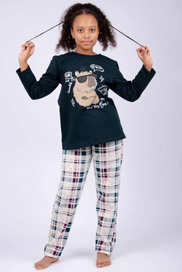 Теплая детская пижама с брюками для девочек выполнена из футера с начесом. Пижама для детей станет любимым атрибутом отдыха девочки, благодаря свободному крою и нежному цвету. Милый принт капибара поднимает настроение и создает уютную атмосферу. Домашняя пижамка выполнена из трикотажной ткани футер, которая идеальна для зимы. Начес отлично сохраняет тепло. Она не боится частых стирок и надолго сохраняет первоначальный внешний вид.