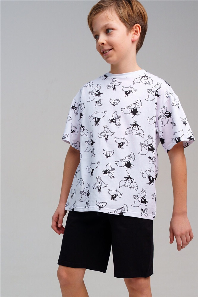 Пижама для мальчика подростка. Футболка и шорты из эластичного и приятного на ощупь трикотажа. Шорты на резинке со шнурком. Шорты с карманами в боковых швах. Высокое содержание хлопка 95%. Благодаря наличию эластана в составе ткани изделие держит форму и меньше мнется.