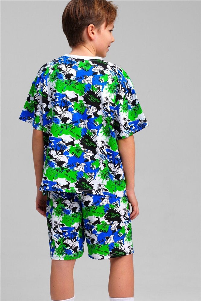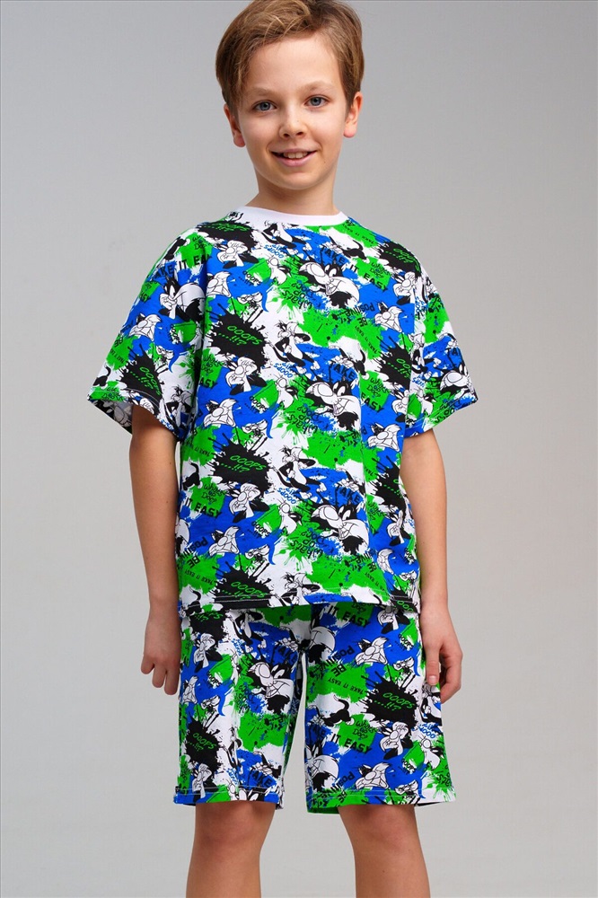 ID товара: 1088802 Состав: 95% Хлопок, 5% Эластан Сезон: Демисезон Длина: Средняя Фасон: Свободный Рукав: короткие Декоративные элементы: Принт Основная ткань: Хлопок Страна бренда: Германия Страна производства: Китай Пижама для мальчика подростка. Футболка и шорты из эластичного и приятного на ощупь трикотажа. Шорты на резинке со шнурком. Высокое содержание хлопка 95%. Благодаря наличию эластана в составе ткани изделие держит форму и меньше мнется. Комментарии к товару