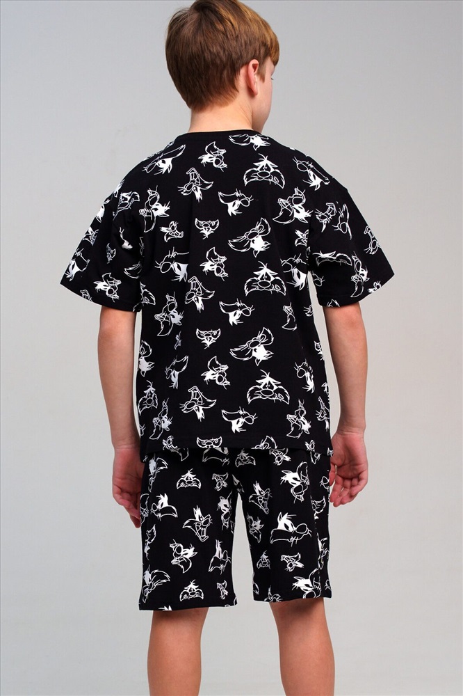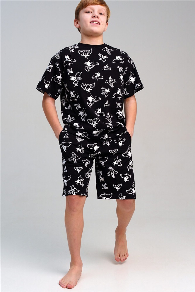 Пижама для мальчика подростка. Футболка и шорты из эластичного и приятного на ощупь трикотажа. Шорты на резинке со шнурком. Шорты с карманами в боковых швах. Высокое содержание хлопка 95%. Благодаря наличию эластана в составе ткани изделие держит форму и меньше мнется.
