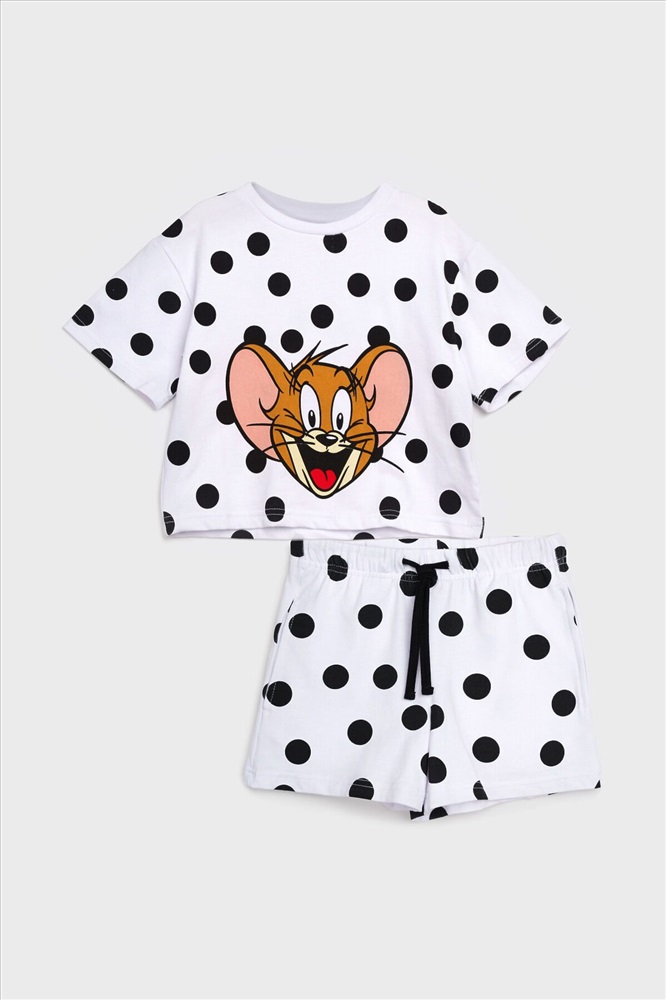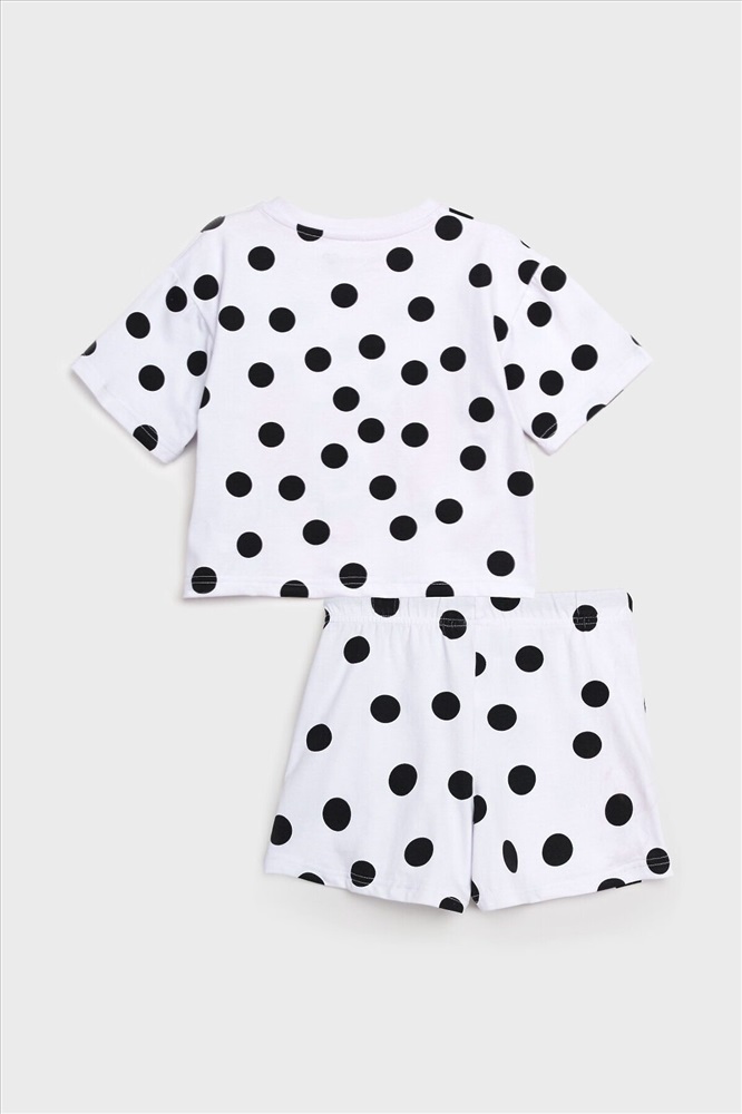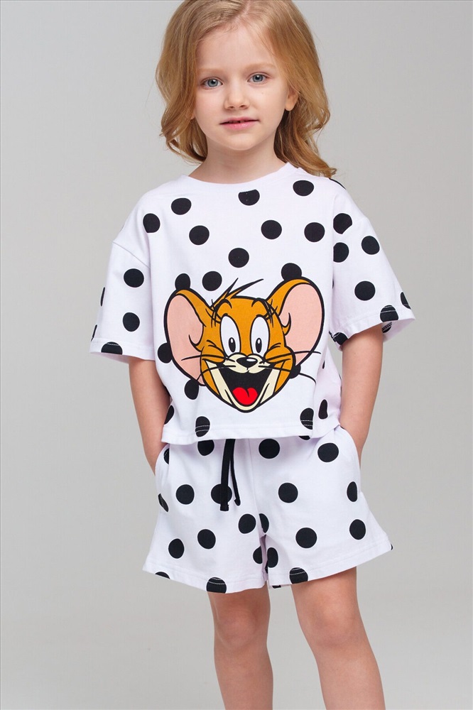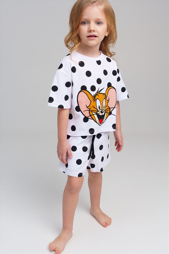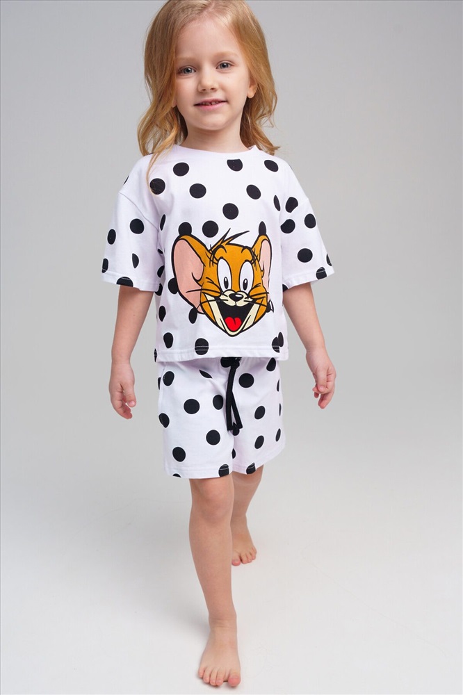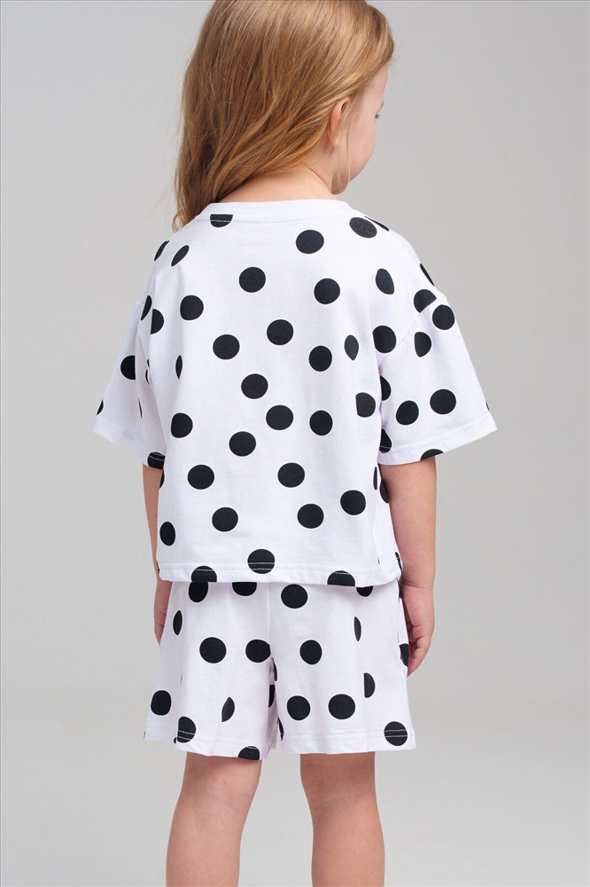 Пижама детская для девочки. Футболка оверсайз и шорты из эластичного и приятного на ощупь трикотажа. Шорты на резинке со шнурком. Высокое содержание хлопка 95%. Благодаря наличию эластана в составе ткани изделие держит форму и меньше мнется.