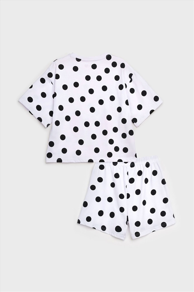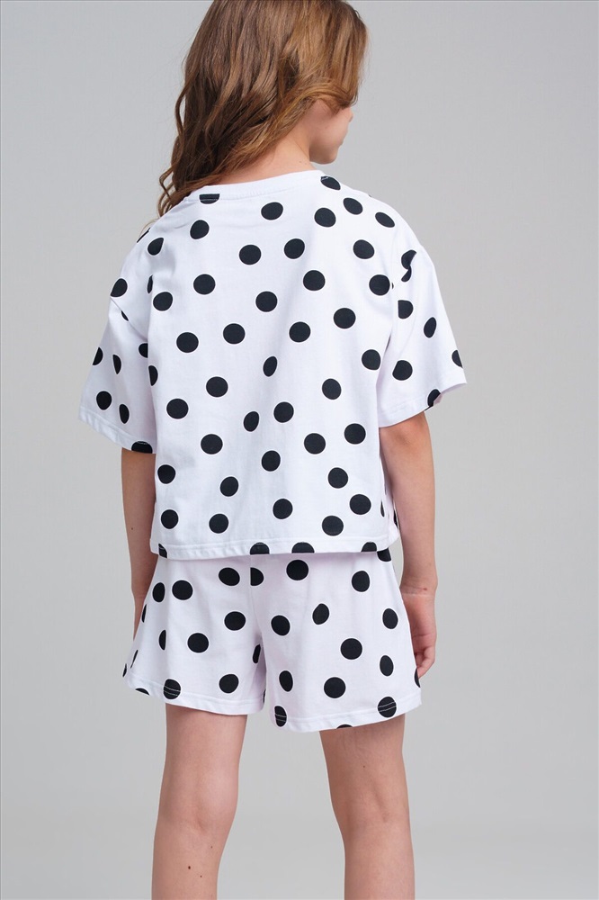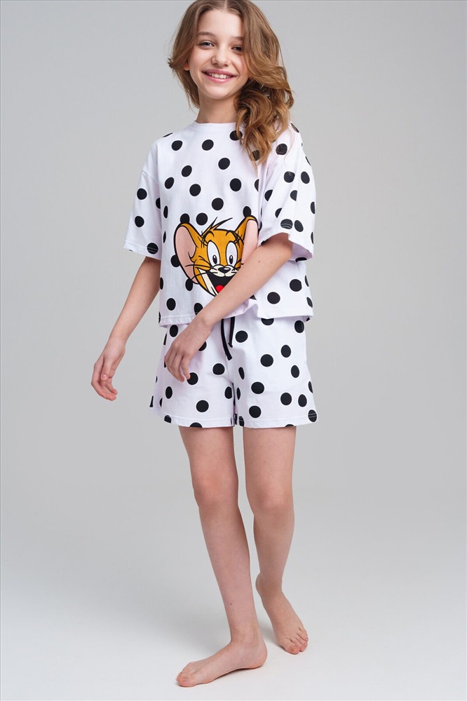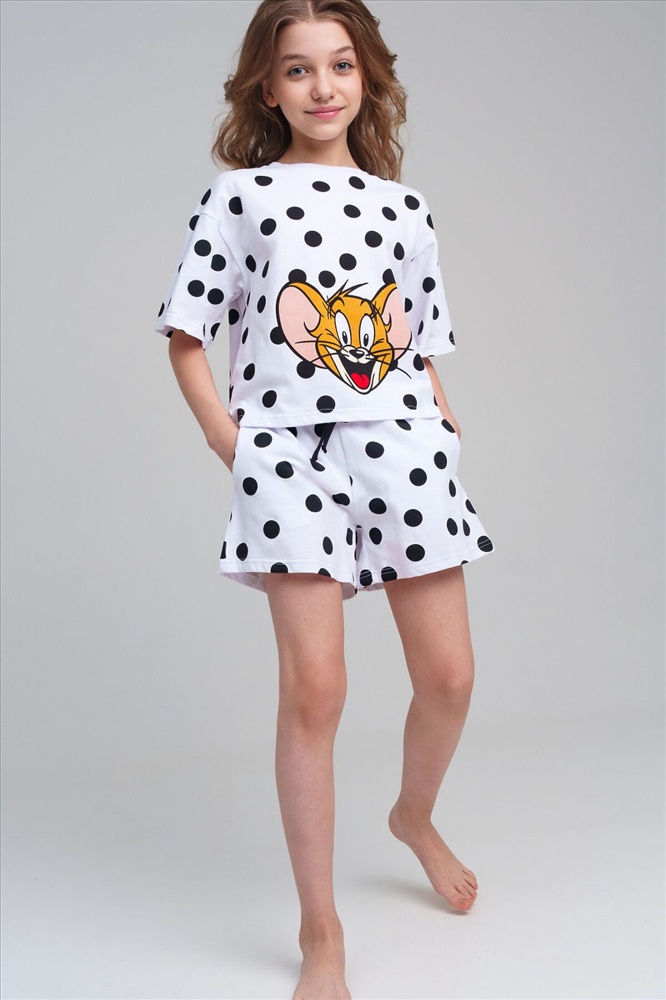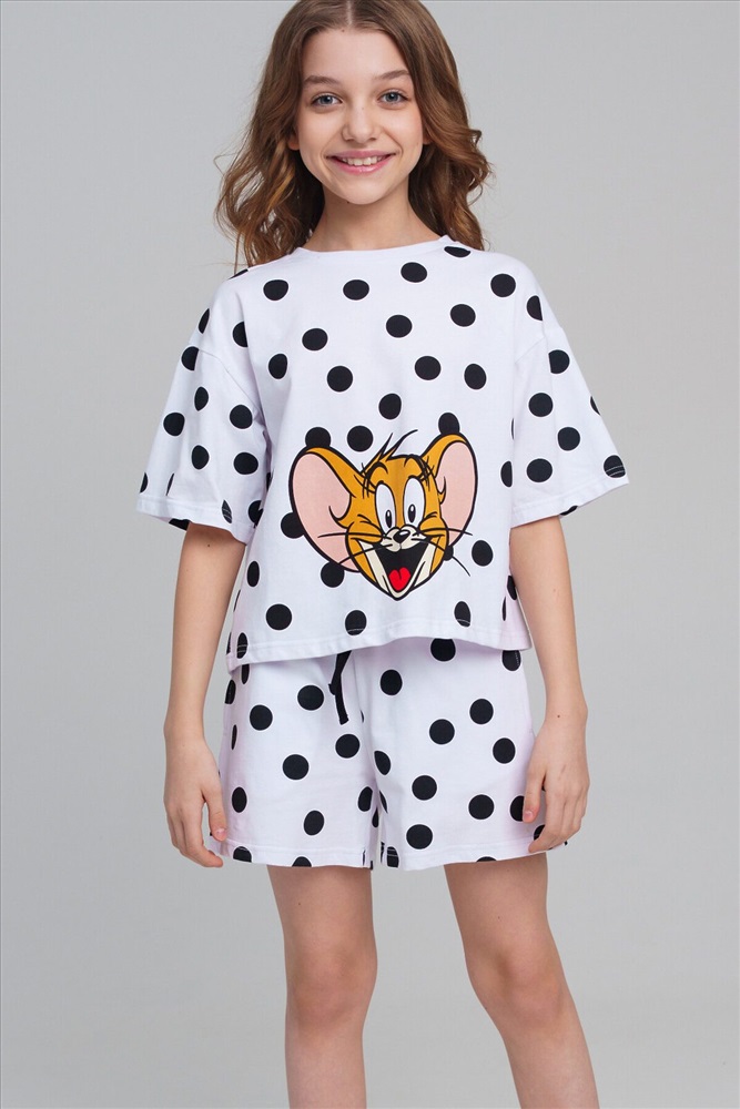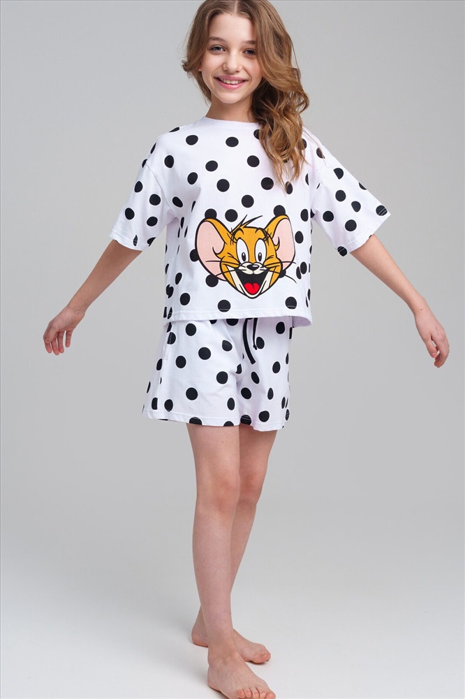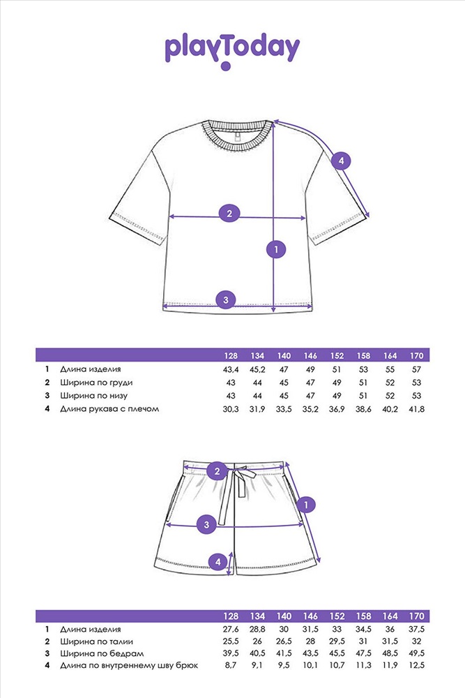 Пижама для девочки подростка. Футболка и шорты из эластичного и приятного на ощупь трикотажа. Шорты на резинке со шнурком. Высокое содержание хлопка 95%. Благодаря наличию эластана в составе ткани изделие держит форму и меньше мнется.