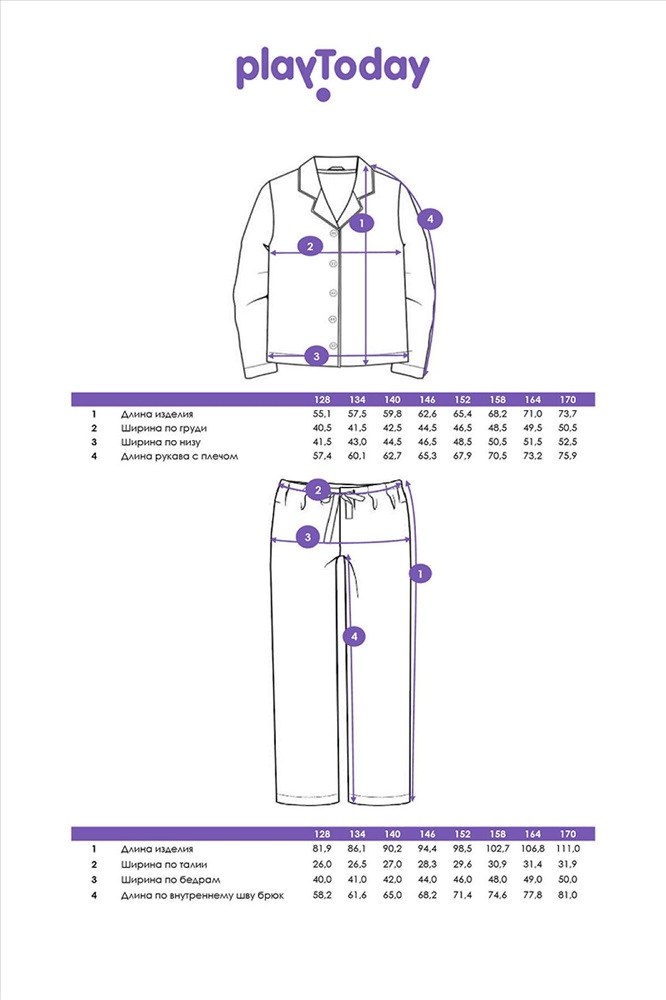 ID товара: 1221070 Состав: 100% Хлопок Сезон: Демисезон Длина: Полная Фасон: Прямой Рукав: Длинные Вид застежки: Пуговицы Декоративные элементы: Принт Основная ткань: Хлопок Страна бренда: Германия Страна производства: Китай Стильная подростковая фланелевая пижама для девочки PlayToday — удобный комплект с микроначёсом. В набор входит рубашка с пуговицами и прямые брюки на резинке. Теплая и уютная ткань обеспечивает комфортный сон и подходит для домашнего отдыха в прохладное время года. Преимущества модели: + натуральная фланель с микроначёсом — мягкая, дышащая и приятная к телу + застёжка на пуговицы — классический и удобный вариант + два накладных кармана — практичное решение для дома + пояс на резинке — удобная посадка без давления + современный клетчатый дизайн — стильный вариант для девочек и подростков Когда и как носить: Пижама идеально подойдёт для сна, отдыха дома, поездок на дачу и гостевых ночёвок. Благодаря стильному клетчатому принту она выглядит современно и может использоваться как домашний костюм. Совет по стилю: Сочетайте пижаму с мягким халатом и уютными тапочками PlayToday, чтобы создать полный домашний образ. Размеры: 128–170 см — для девочек от 8 лет и старше. Подходит для школьниц и подростков. Стильная клетчатая фланелевая пижама для девочек от PlayToday — тепло, уют и современный дизайн для сна и дома. Комментарии к товару
