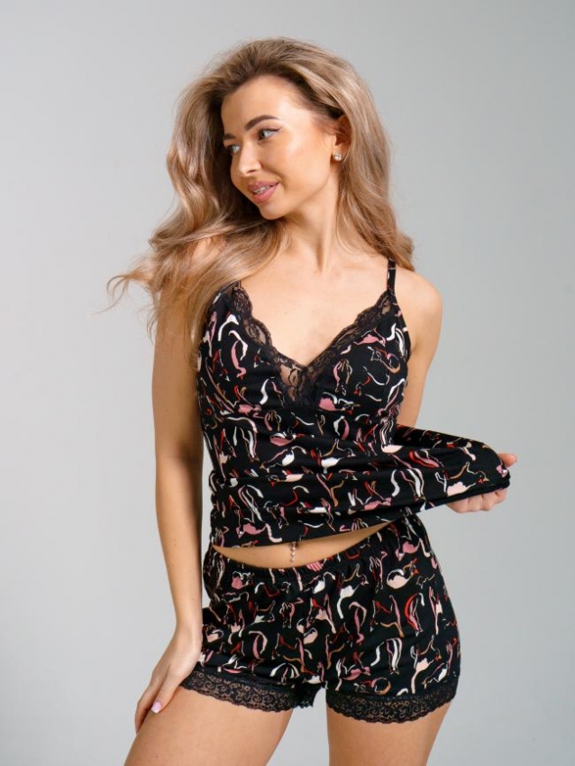 Оригинальное сочетание ткани и кружева делает эту Пижаму особенной. Прилегающий покрой и изящные кружевные элементы сделают вас стильной и привлекательной. Материал высокого качества приятен к телу и практичен в носке. Пижама из вискозы повторяет изгибы тела, облегает и не ограничивает подвижность за счет способности тянуться. Для большего комфорта резинка закреплена в шве шорт, что предотвращает ее смещение и скручивание. Просит Вас изучить рекомендации по уходу, которые указаны на этикетке. Их соблюдение поможет сохранить качество и форму полюбившихся вещей.