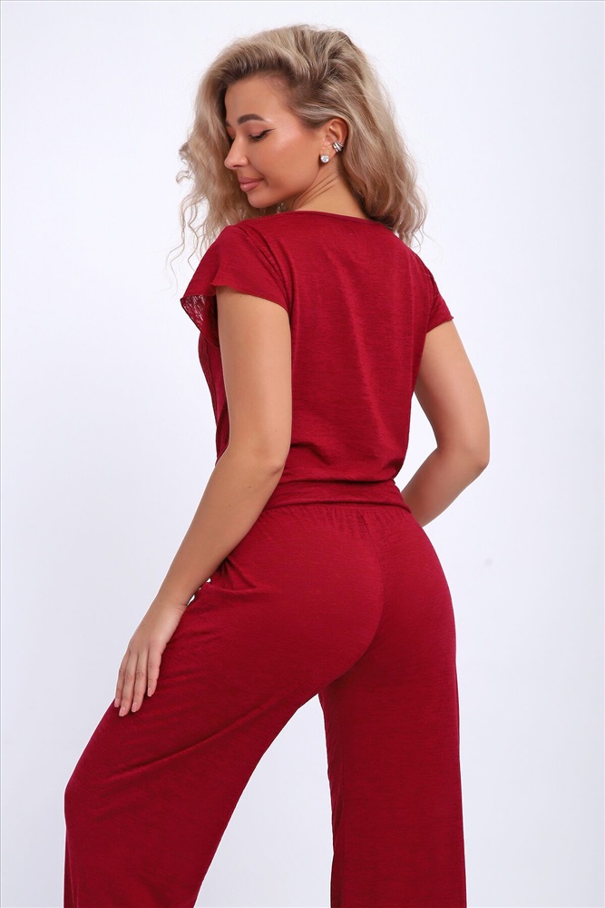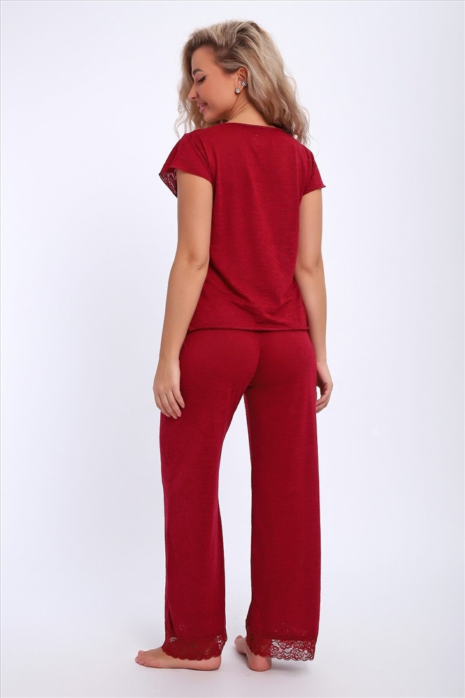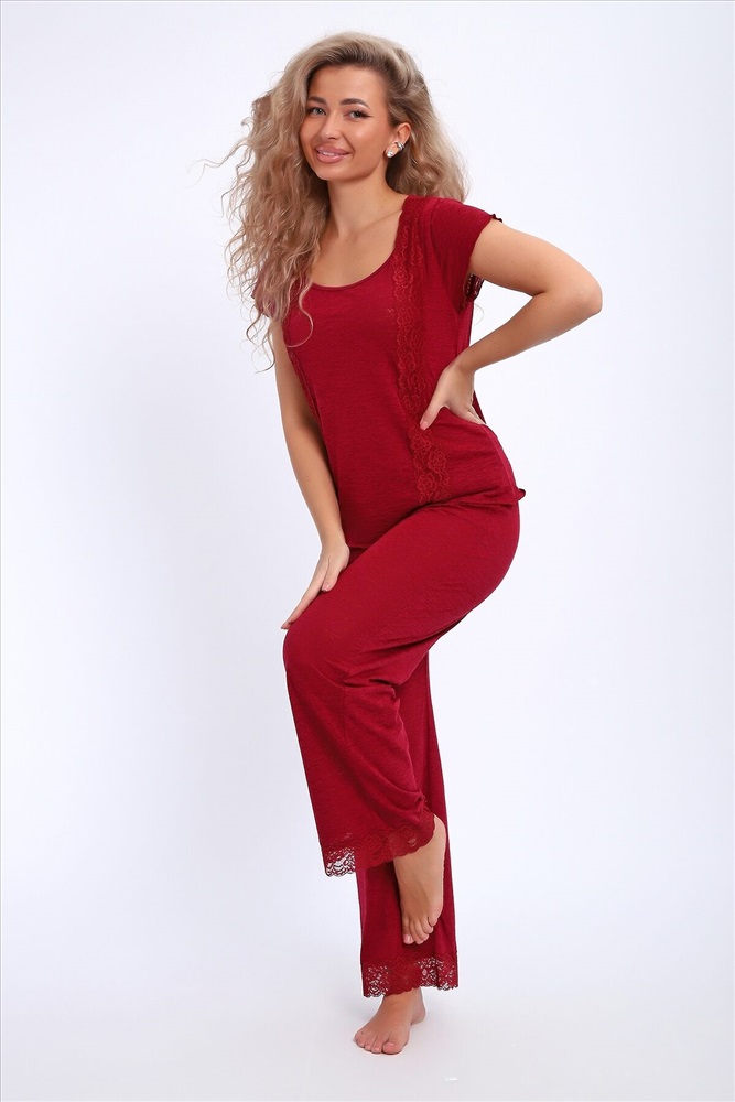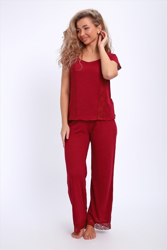 Пижама состоит из топа и брюк, оптимальной ширины. Выполнена из однотонного трикотажа с кружевом, что придает ей особый шарм и изысканность. Размеры варьируются от 42 до 56, что позволяет каждой женщине подобрать для себя идеальный вариант, подчеркнуть ее индивидуальность и сделать образ неповторимым. Топ свободного силуэта с короткими рукавами-крылышками декорирован вставкой полупрозрачного кружева в тон изделия. Низ брюк также обрамляет изящное кружево в тон. Данная пижама придется по вкусу всем, кто ценит комфорт, стиль и качество в одежде.