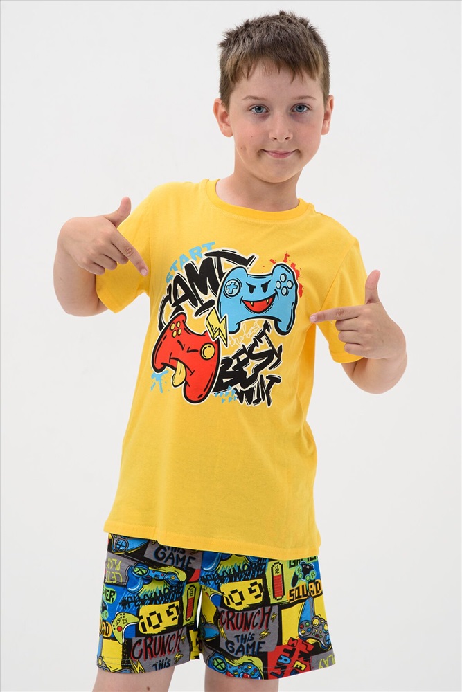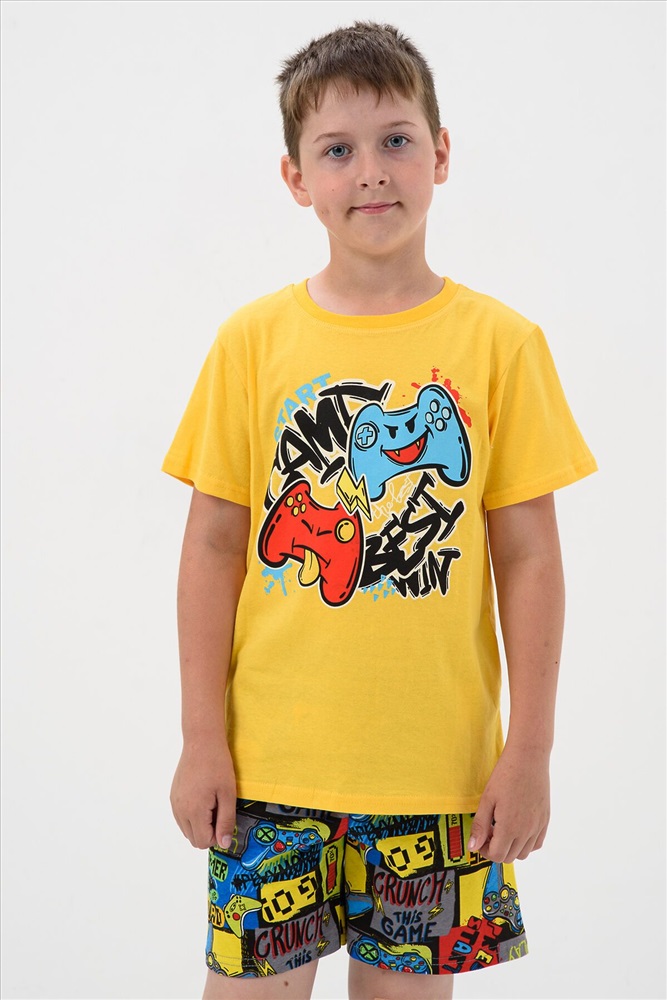 Пижама для мальчика, состоящая из футболки - однотонное полотно с нанесением печати и шорт - полотно с рисунком, выполнена из мягкой, приятной к телу трикотажной ткани средней плотности, 100% хлопок. Пижамка согревает, даже если ребенок ворочается и раскрывается во сне, а также создает ощущение уюта, ребенок спит глубже и реже просыпается. Также стильная пижама для подростков создает хорошее настроение. Можно носить как домашний костюм или использовать как летнюю пижаму, для дома или в садике. Пижамный костюм без карманов для полного комфорта во сне и застежек, свободного полуприлегающего силуэта, для комфортного сна ребенка. Пижамные шорты с удобной посадкой и нетугой резинкой. Яркий и модный молодежный пижамный стиль для детей и подростков, пижама для мальчика подростка.