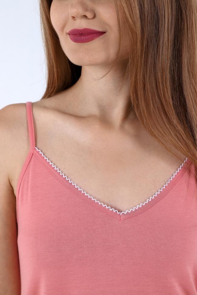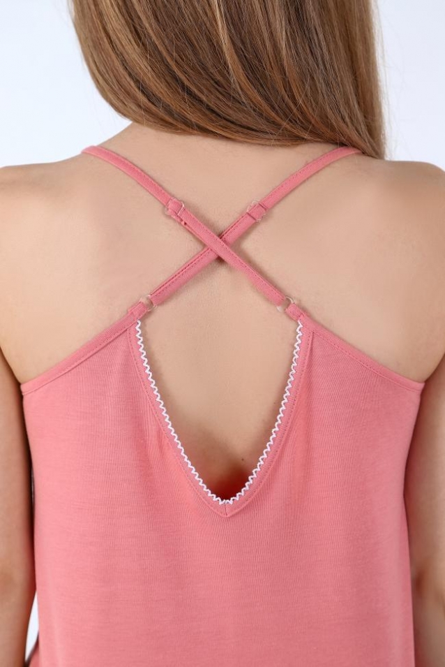 Пижама молодежная из трикотажного гладкокрашеного трикотажного полотна «джерси», состоящая из майки и шорт. Майка – слегка расширенна книзу, без рукавов, с V-образным вырезом горловины переда и спинки. Горловина окантована основным материалом и дополнительно украшена декоративной строчкой «кроше» нитками контрастного цвета. На спинке - декоративный элемент в виде перекрещенных между собой бретелей. Проймы окантованы основным материалом.Шорты – свободного покроя, средней длины, с эластичной тесьмой по талии.