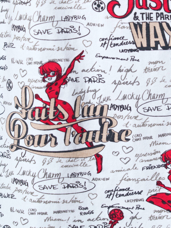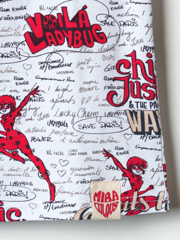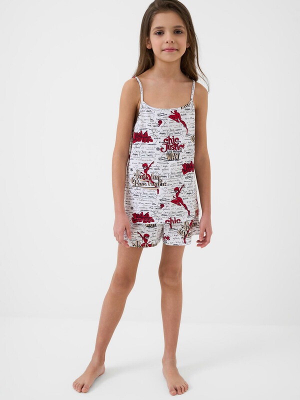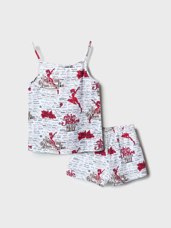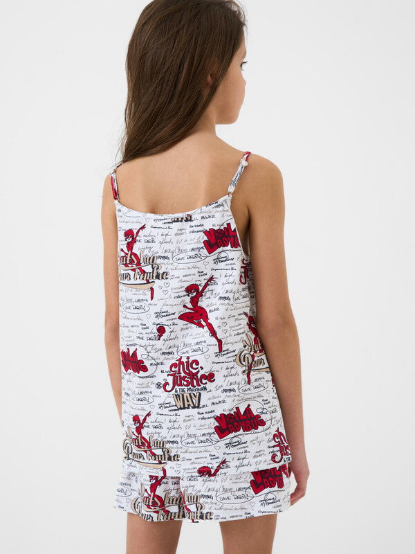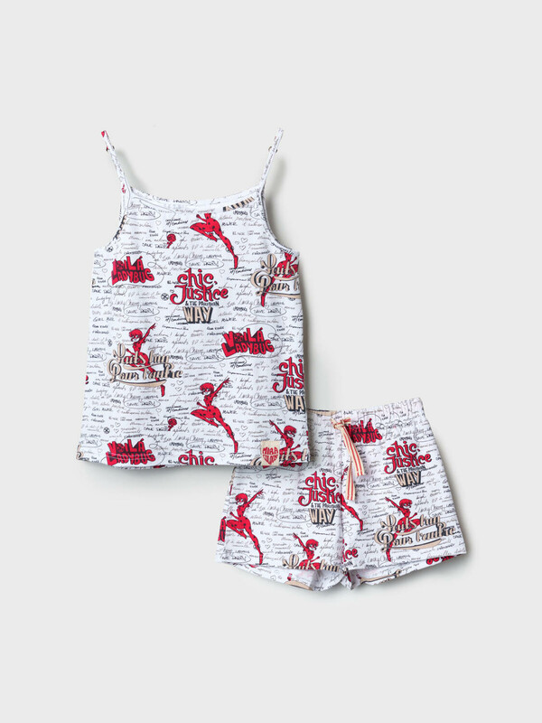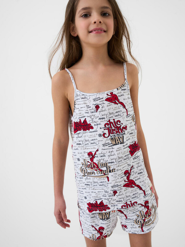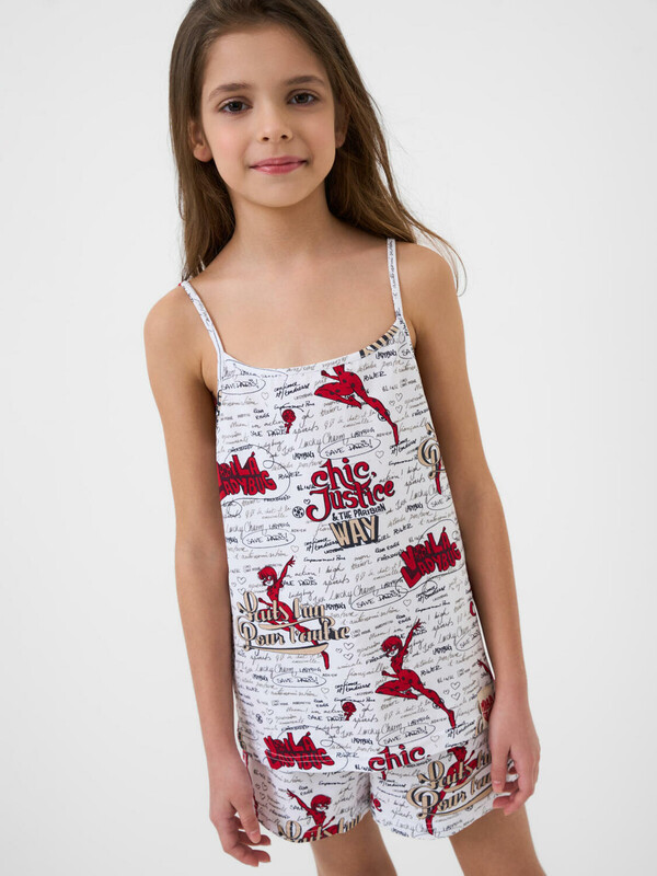 Пижама для девочки подростка. Состоит из майки на тонких регулируемых бретельках и шорт в комплекте. Майка и шорты дополнены, насыщенным принтом, вдохновлённым мультфильмом "Леди Баг и Супер-Кот". Майка имеет прямой свободный крой и длину до середины бедра. Шорты на резинке с регулируемым шнуром.