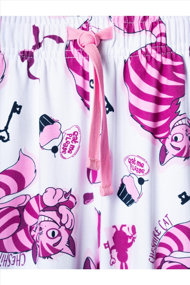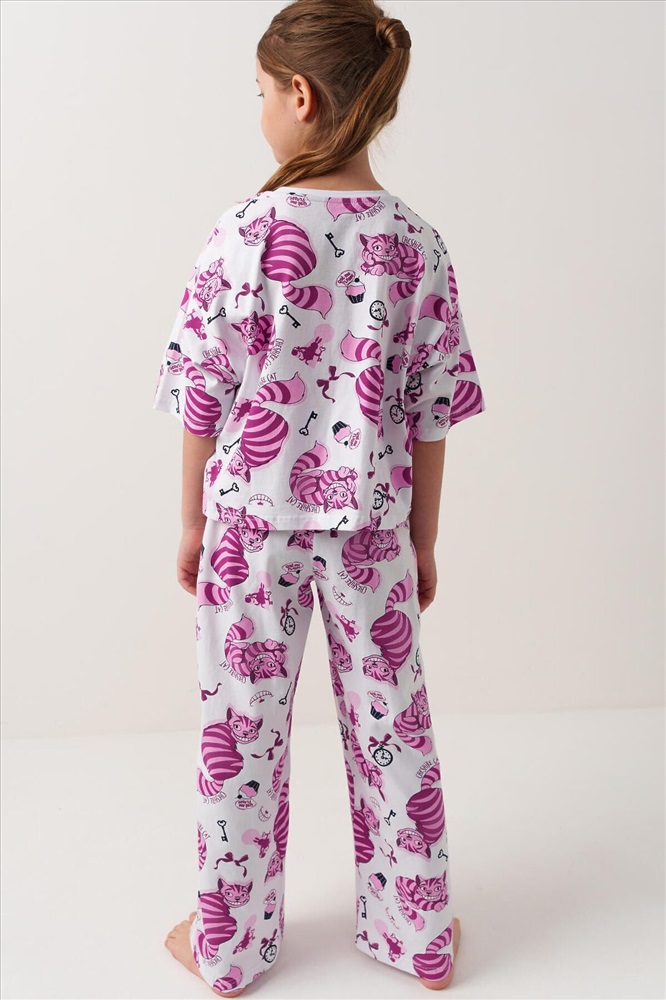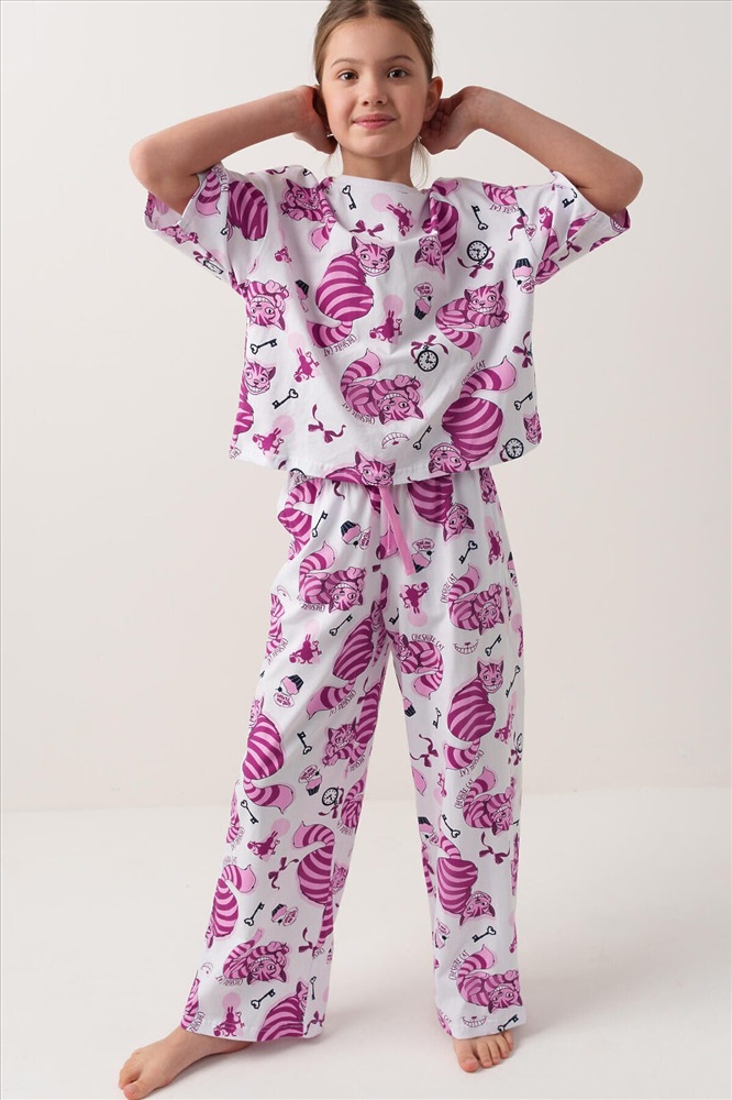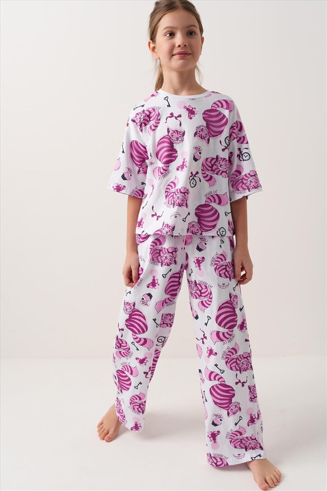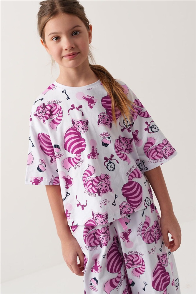 Пижама для девочки подростка. Комплект состоит из футболки оверсайз с короткими рукавами и длинных широких брюк. Изделие украшено ярким принтом с Чеширским котом, часами и ключами. В поясе брюк предусмотрен удобный шнурок для регулировки. Материал — мягкий и комфортный хлопковый трикотаж.