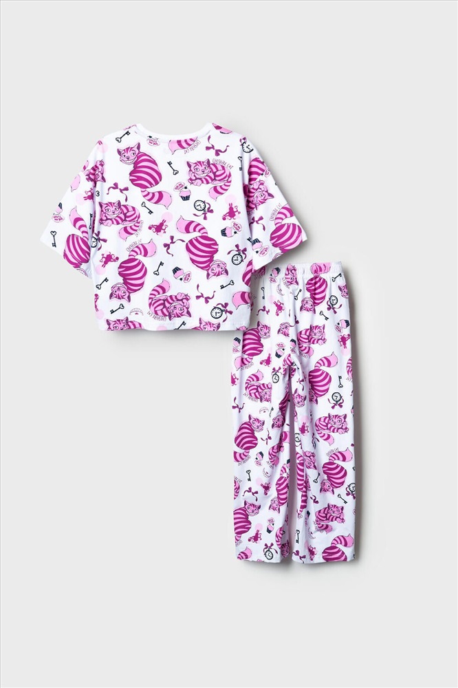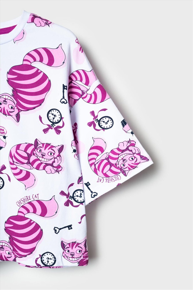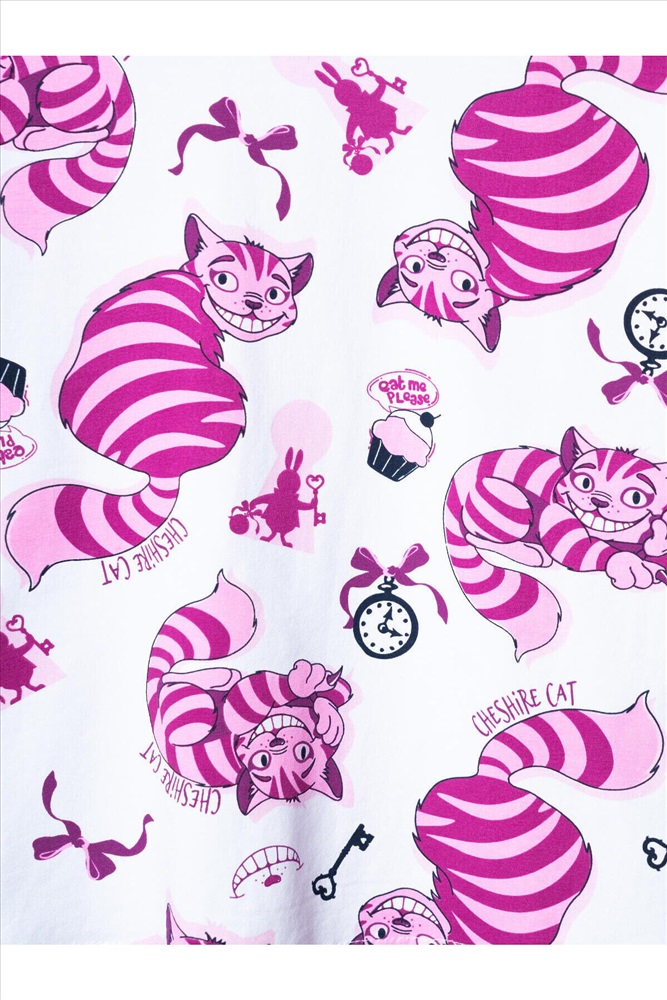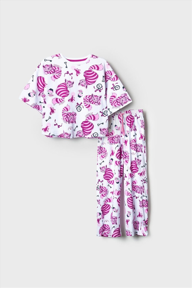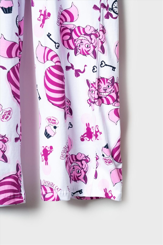 Пижама для девочки подростка. Комплект состоит из футболки оверсайз с короткими рукавами и длинных широких брюк. Изделие украшено ярким принтом с Чеширским котом, часами и ключами. В поясе брюк предусмотрен удобный шнурок для регулировки. Материал — мягкий и комфортный хлопковый трикотаж.