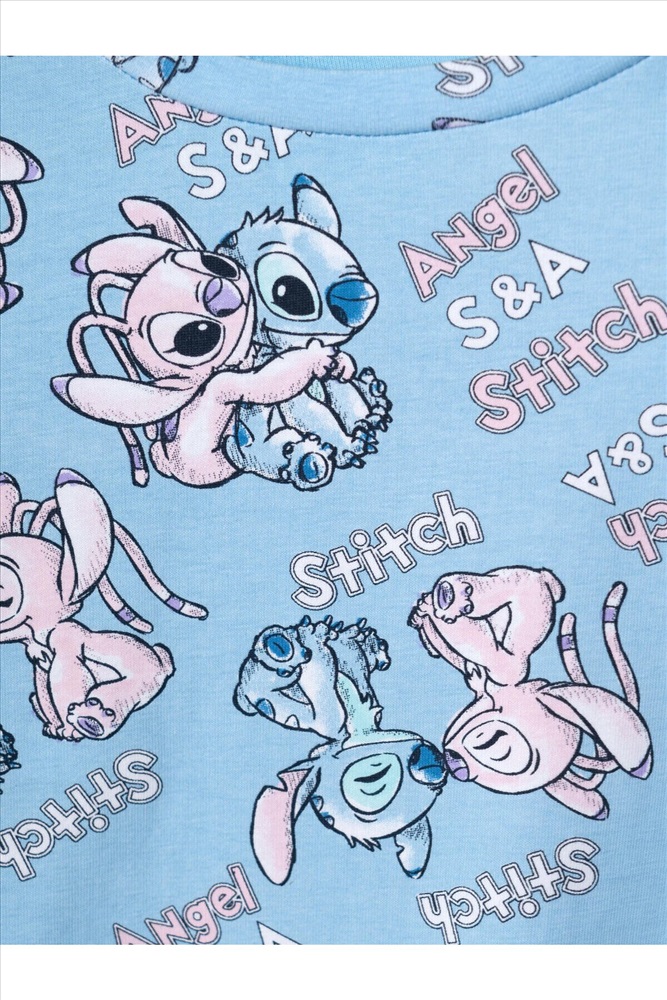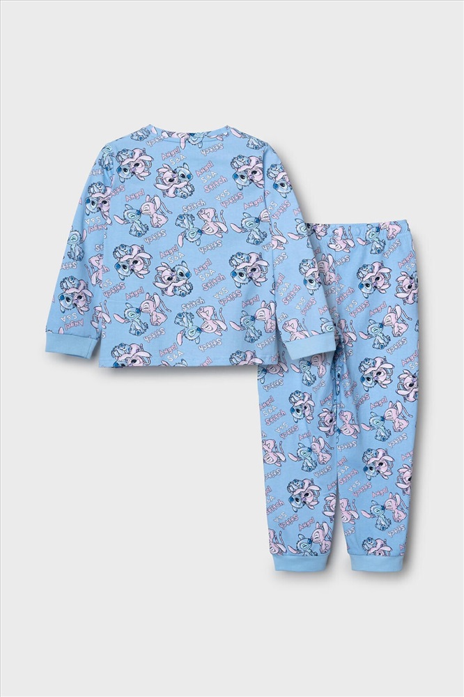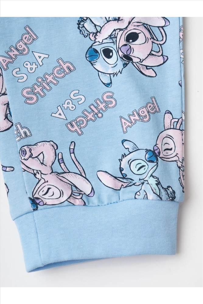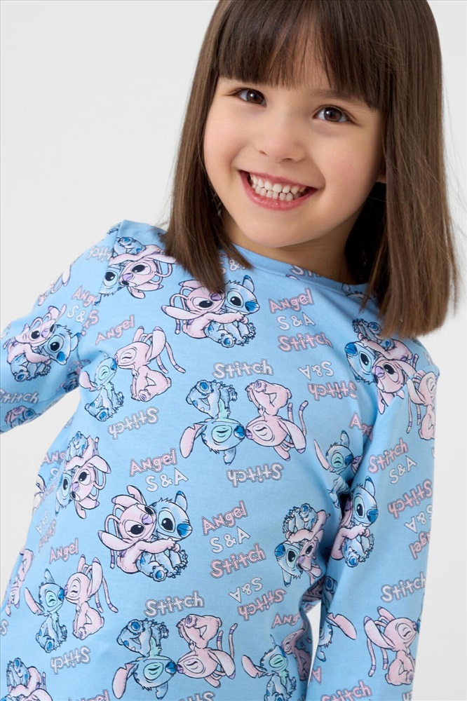 Детская пижама для девочки. Комплект из лонгслива, прямого кроя с длинными рукавами и брюк. Изделие выполнено из мягкого, хлопкового трикотажного материала и украшено ярким принтом с героями мультфильма Лило и Стич. У лонгслива круглая горловина и манжеты на рукавах, у брюк — удобный пояс на резинке, дополненный декоративным белым шнурком. Манжеты по низу брюк делают модель комфортной в носке.
