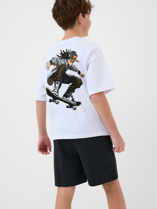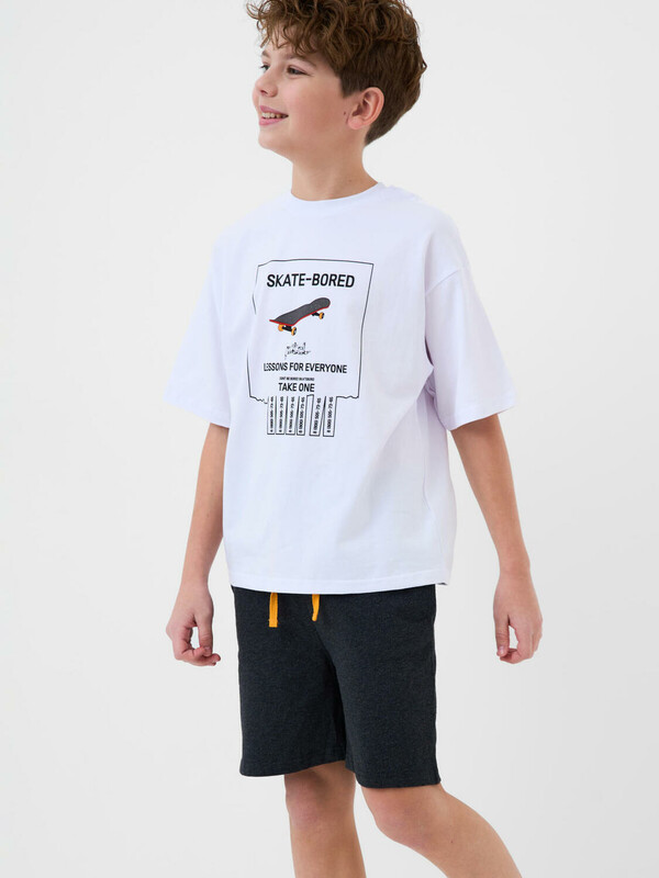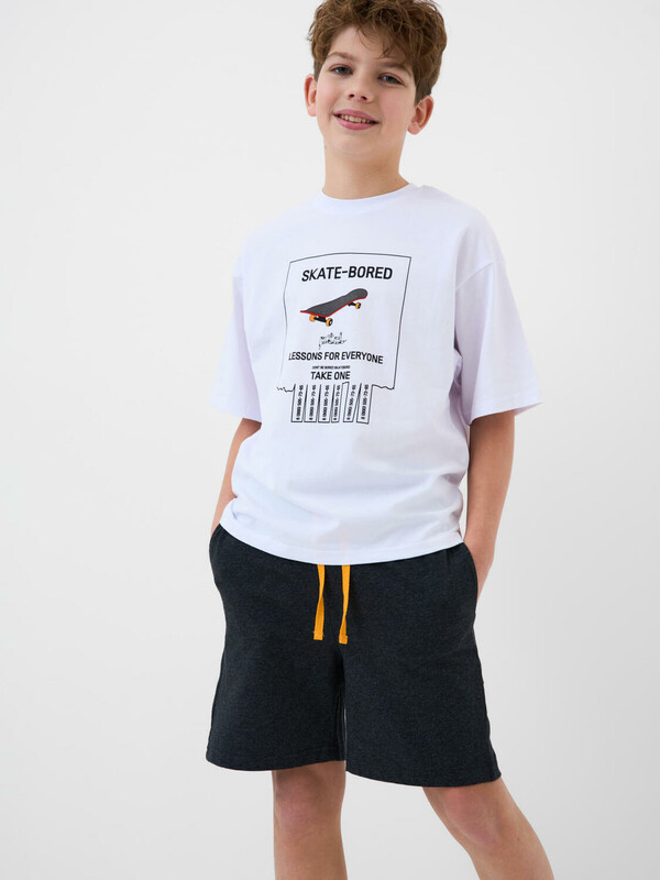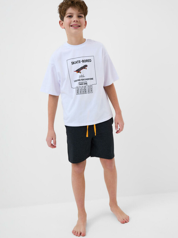 Пижама для мальчика подростка. Футболка оверсайз с короткими рукавами и круглым воротом оформлена крупным принтом на спинке с изображением скейтбордиста, а спереди — креативным принтом. Шорты имеют камуфляжный узор в чёрно-серой гамме и дополнены ярко-оранжевым декоративным шнурком в поясе. На шортах предусмотрены боковые карманы. Изделие выполнено из мягкого хлопкового трикотажа.