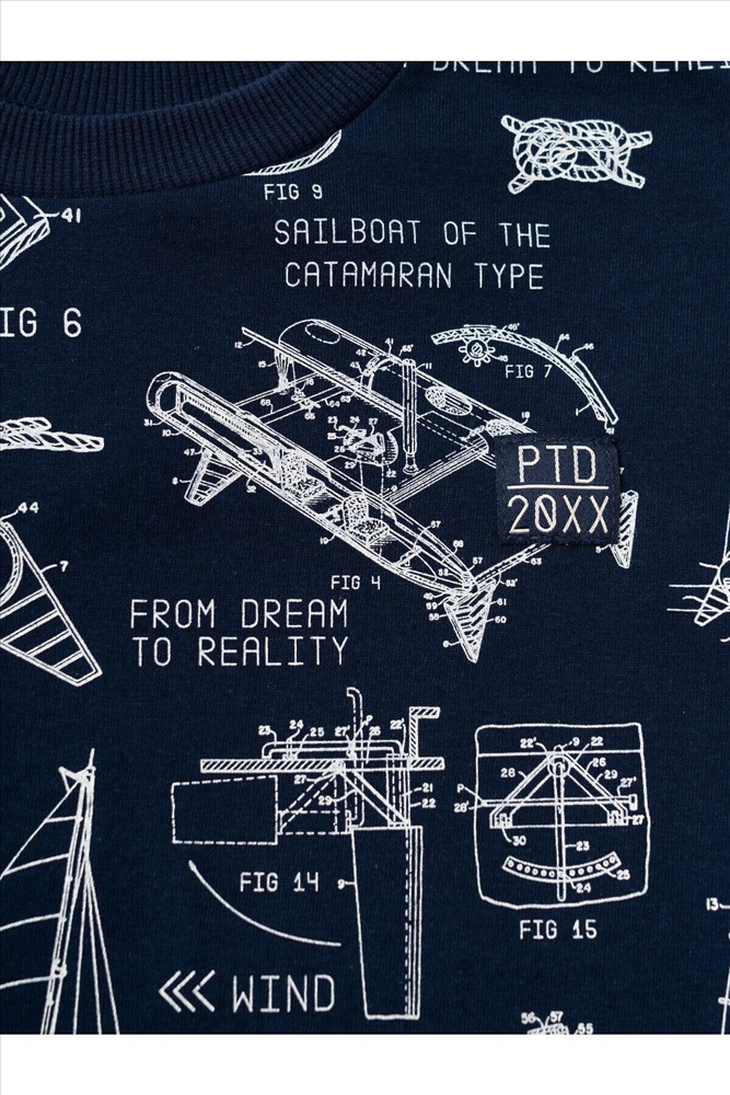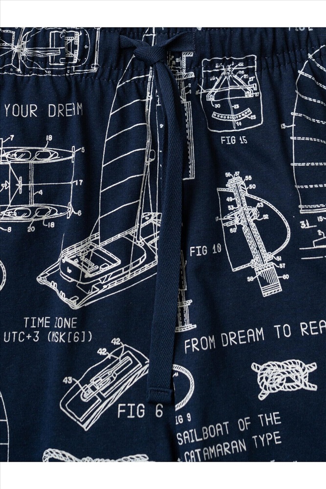 Пижама для мальчика подростка. Комплект состоит из оверсайз футболки с коротким рукавом и шорт. Изделие выполнено из мягкого, хлопкового трикотажа и имеет свободный крой, который обеспечивает комфорт. Принт на ткани — в морской тематике: яхты, схемы. Горловина футболки круглая с эластичной окантовкой, на шортах — удобный пояс с резинкой и завязками, а также карманы в боковых швах.