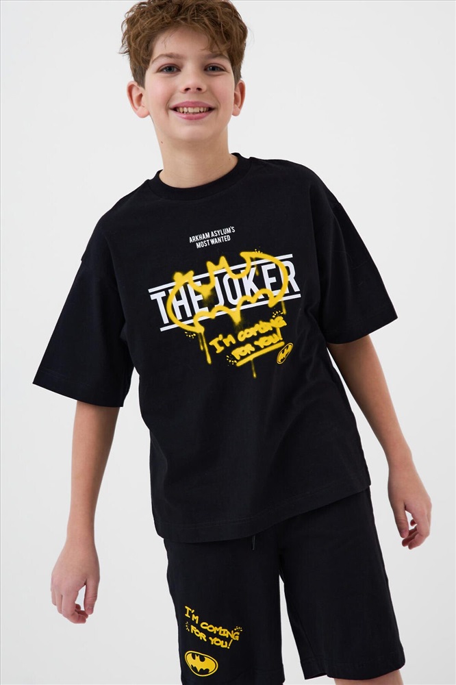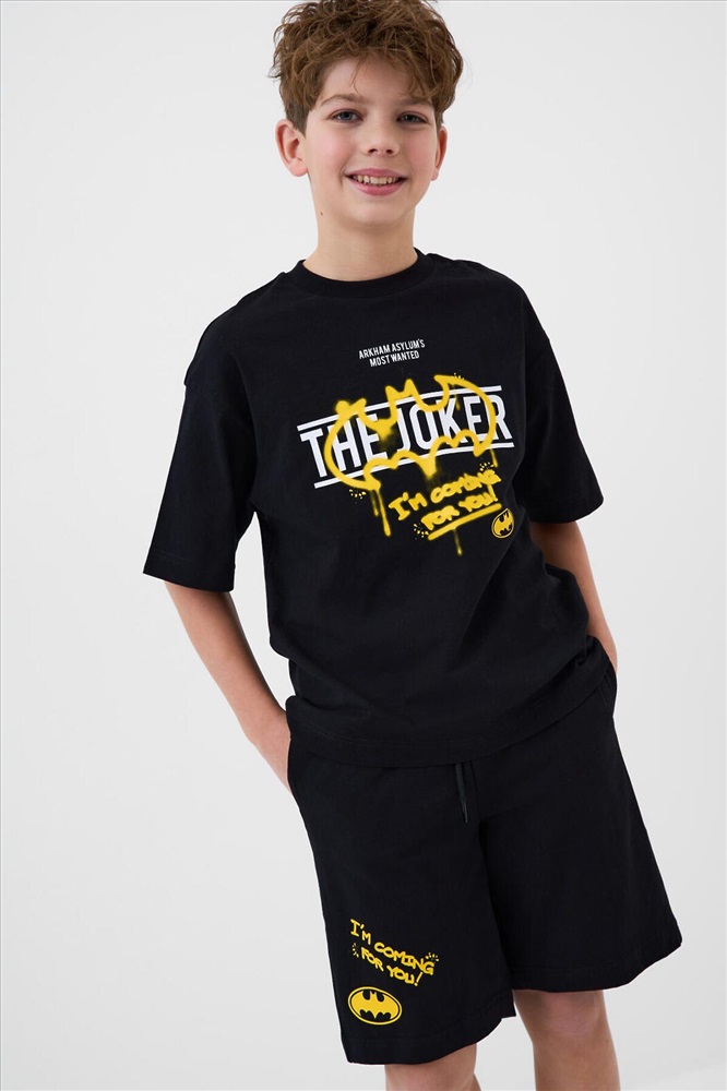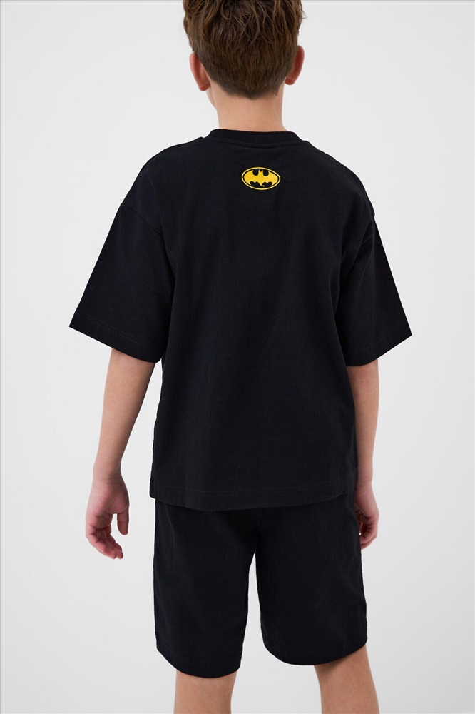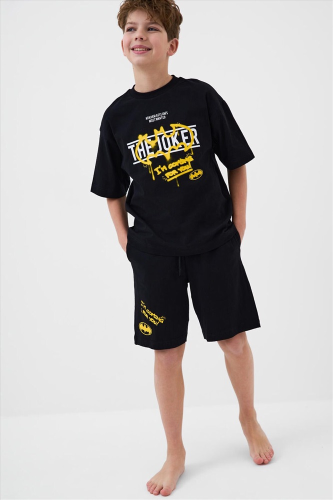Пижама для мальчика подростка. Состоит из чёрной оверсайз футболки и шорт. На футболке — яркий лицензионный принт с Batman. Пояс на резинке со шнурком, по бокам — удобные карманы. Модель выполнена из мягкого, хлопкового трикотажа.