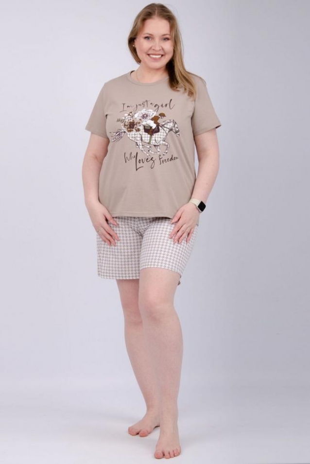 Пижама женская состоит из футболки с коротким рукавом и шортов. Футболка из однотонной кулирки с красивым принтом, шорты свободного покроя из ткани кулирка.