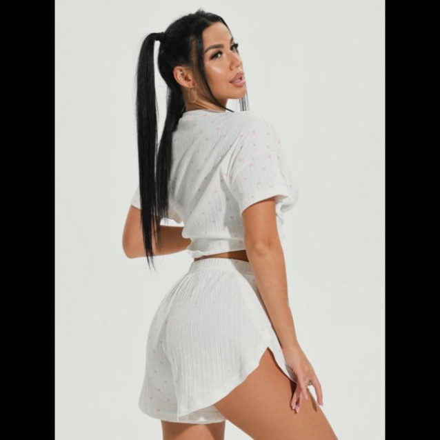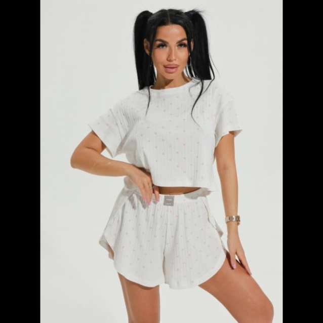 Пижама состоит из футболки и шорт. Футболка, укороченная оверсайз со спущенной линией плеча. Шорты женские свободного покроя. Комментарии к товару
