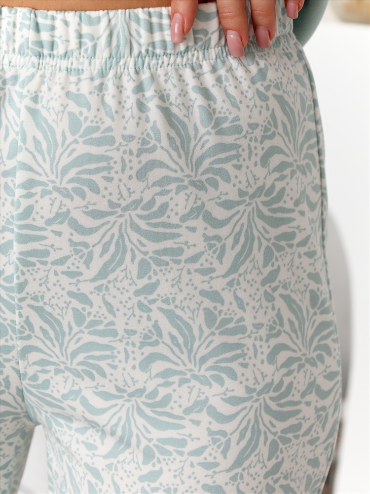 Пижама молодежная из трикотажного полотна «микрофлис» в комбинации двух видов: с набивным рисунком и гладкокрашеного в единой цветовой гамме, состоящая из футболки и брюк. Футболка - из гладкокрашенного полотна, классического покроя, с длинными втачными рукавами, горловиной овальной формы, окантованной основным материалом.Брюки – из полотна с набивным рисунком, свободного покроя, с эластичной тесьмой по талии и притачными манжетами по нижним срезам.