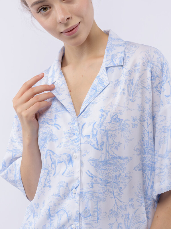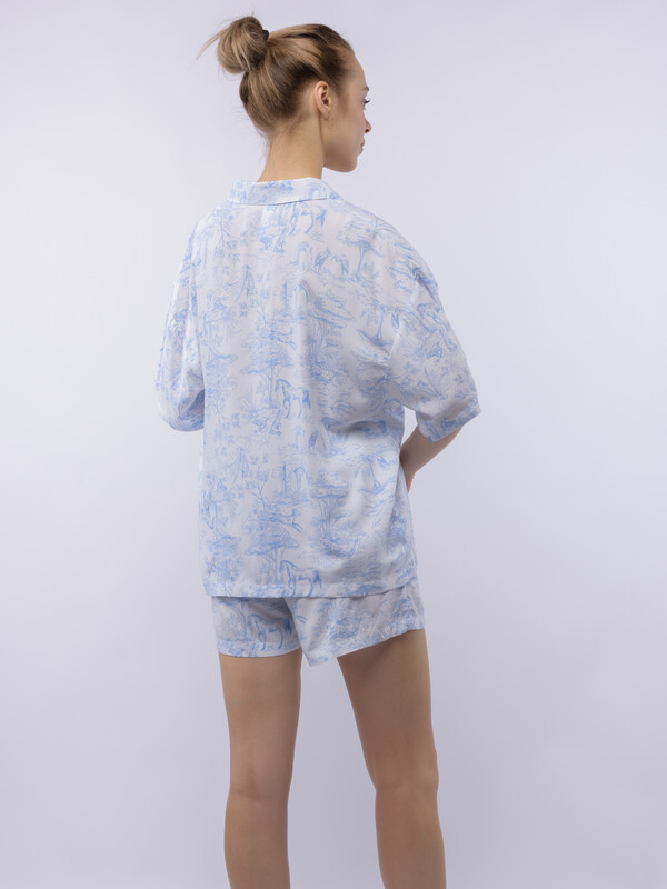 Домашний костюм из тканой вискозы состоит из рубашки и шорт. Принт : «Туаль де Жуи» (Toile de Jouy) — это французская ткань с одноцветным рисунком в синих тонах на светлом фоне, изображающим пасторальные сцены, пейзажи или сцены из жизни XVIII века. Рубашка с английским воротником, на пуговицах, с коротким рукавом. Короткие шорты на резинке. Подгиб и строчка по низу рукава и рубашки и низу брюк. XS-XS(170-84-90), S-S(170-88-94), M-M(170-92-98), L-L(170-96-102), XL-XL(170-100-106)