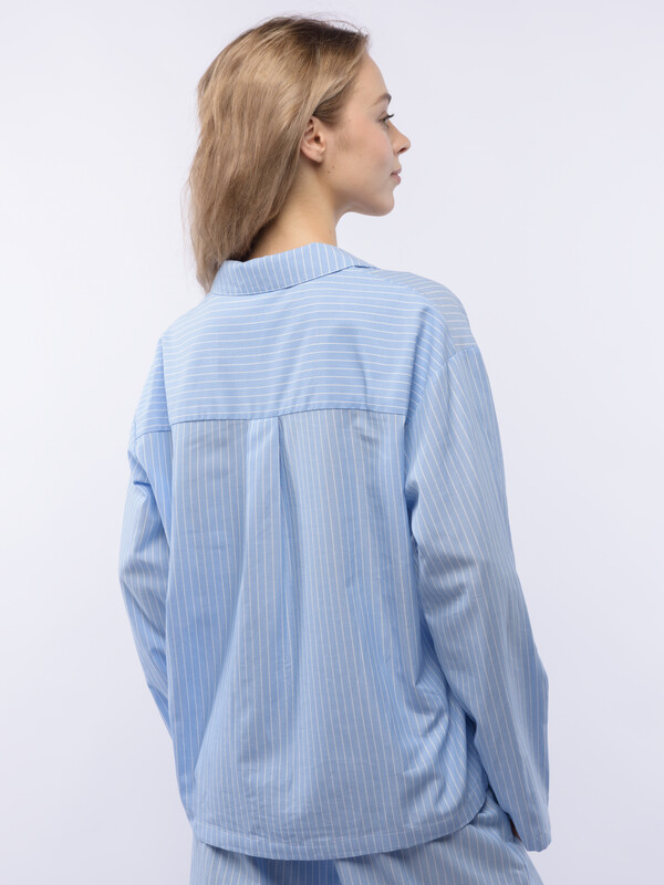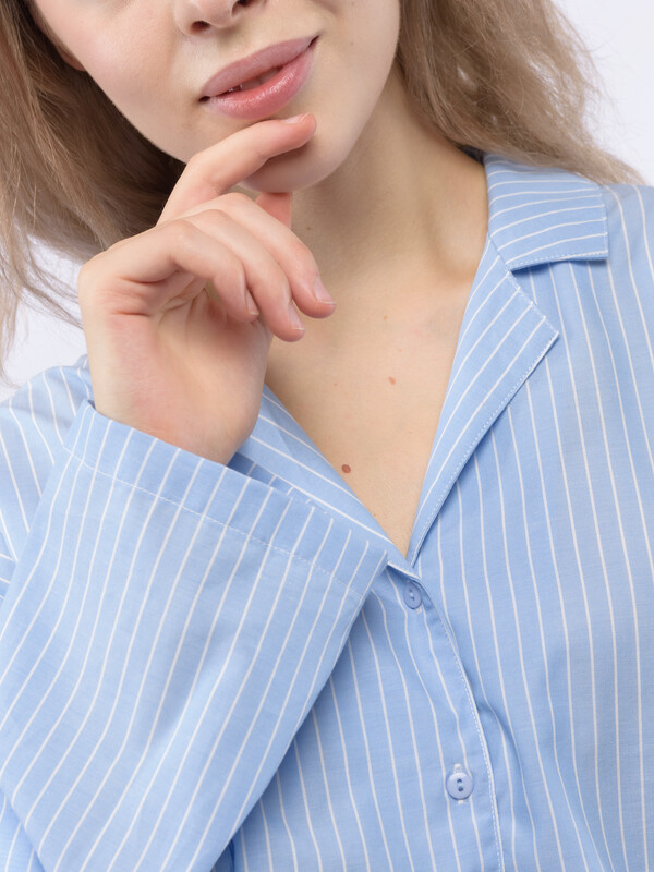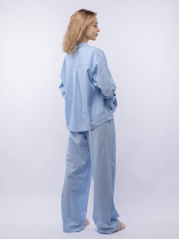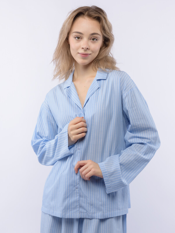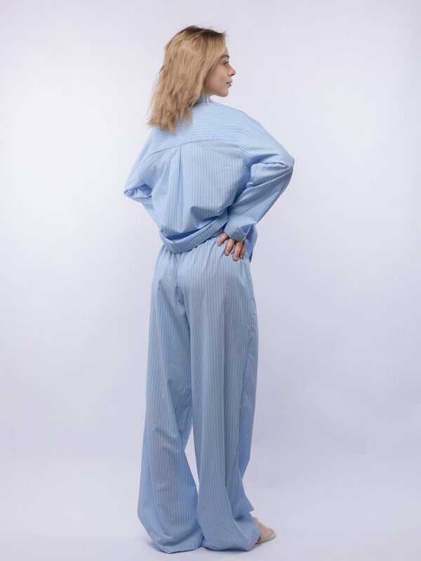 Производитель: Sensera Домашний костюм OVERSIZE из голубого поплина в белую тонкую полоску состоит из рубашки и широких брюк. Рубашка с английским воротником, застежкой на пуговицы и с длинным рукаовм без манжет. Брюки с двойной резинкой : внутренней и внешней принтованной. Подгиб и строчка по низу рукава и рубашки и низу брюк. XS-XS(170-84-90), S-S(170-88-94), M-M(170-92-98), L-L(170-96-102), XL-XL(170-100-106)