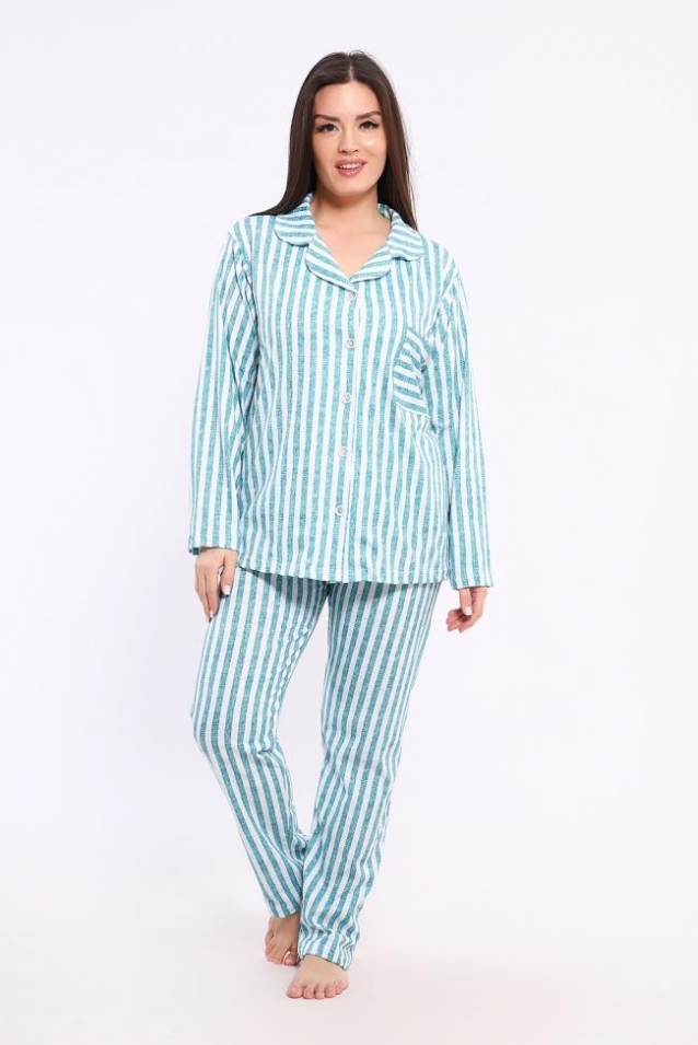 Женская пижама состоит из рубашки с длинным рукавом и брюк. В этом ансамбле вы найдете все - трендовая расцветка, идеальная посадка, широкий размерный ряд. Рубашка свободного покроя застегивается на 5 пуговиц, на груди накладной карман. Брюки прямого покроя с карманами по бокам. Выглядеть прекрасно дома - это просто.